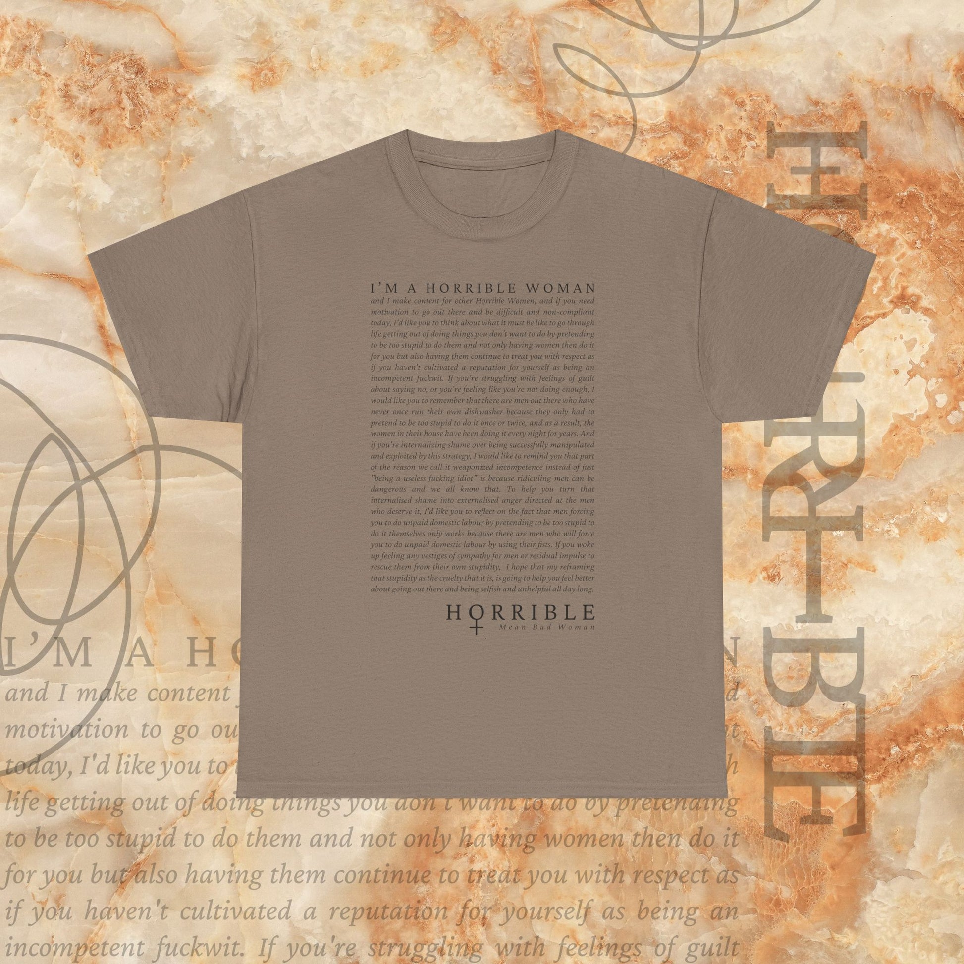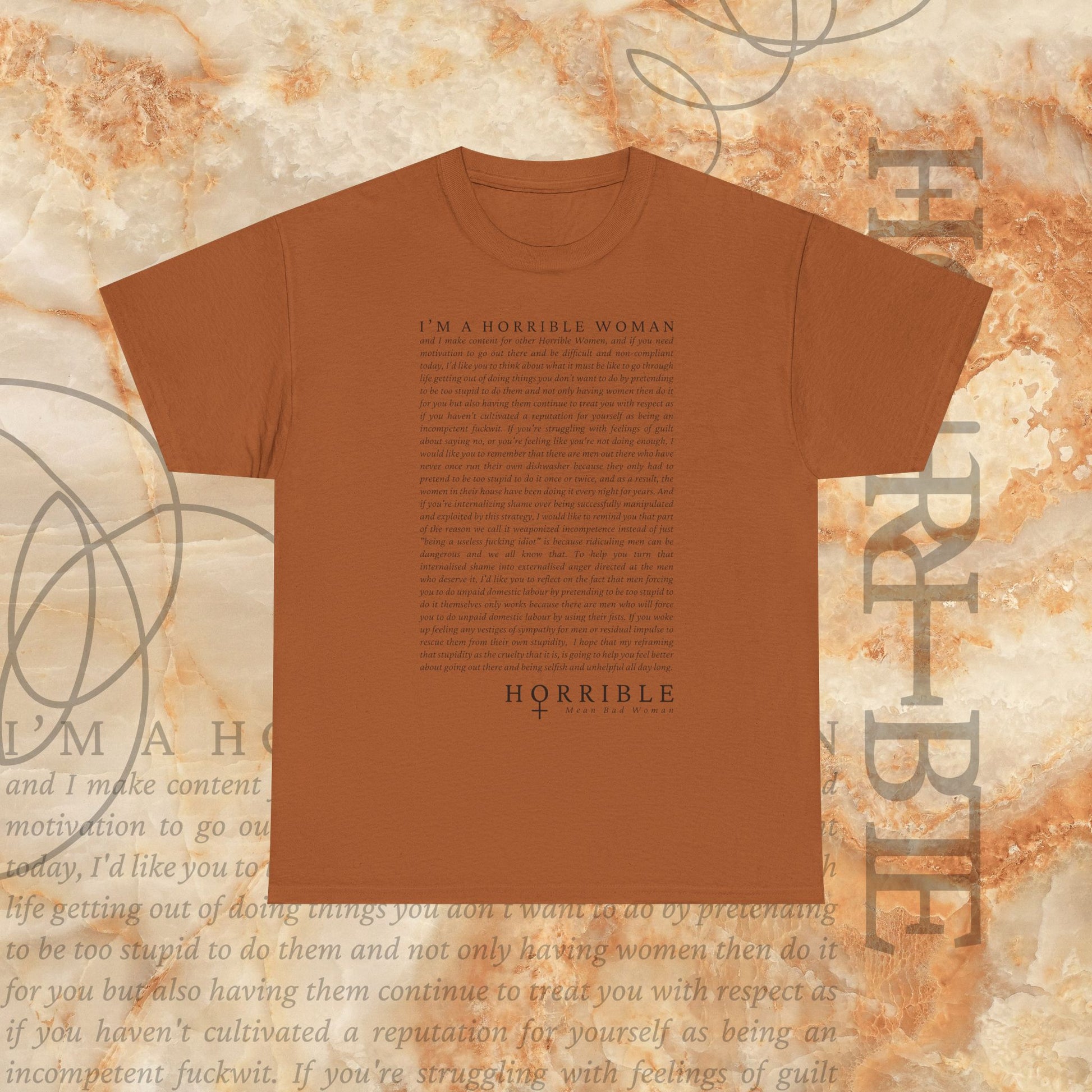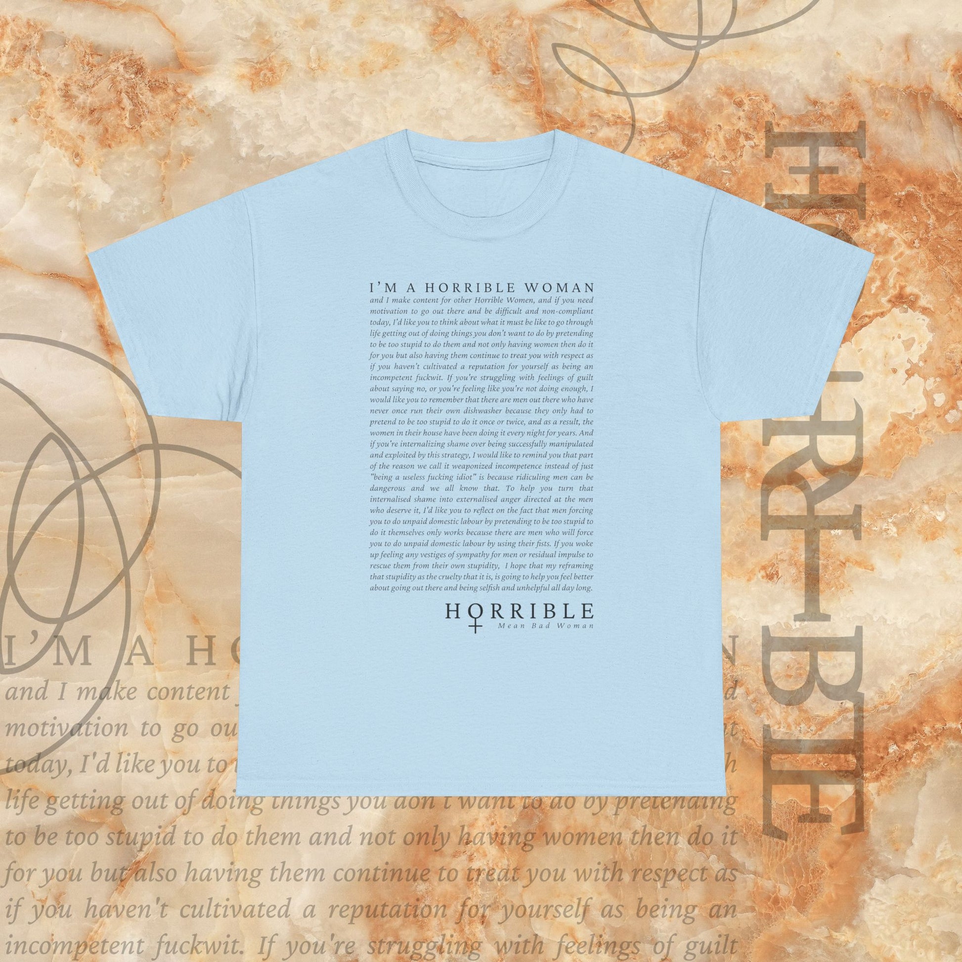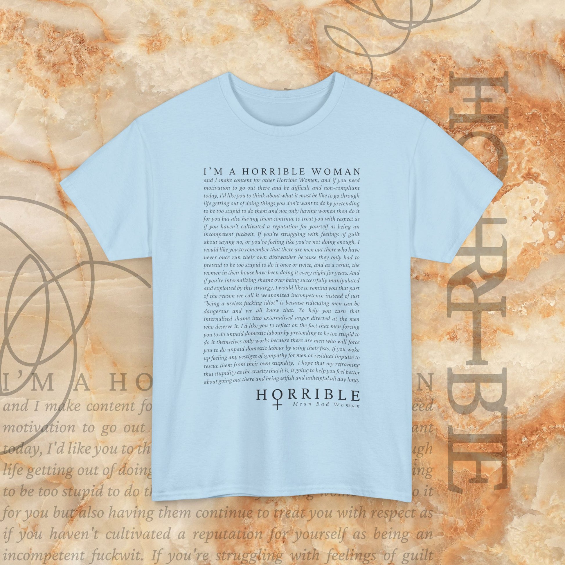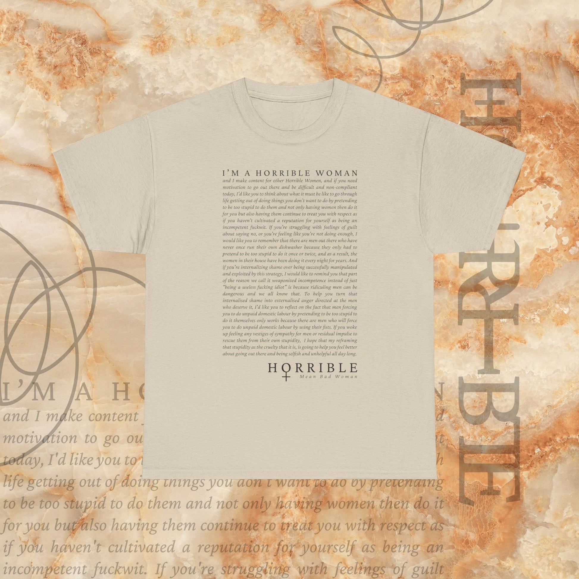Design description: The “A Horrible Rant For Horrible Women” is a cursive script of the following “rant”: "I’M A HORRIBLE WOMAN and I make content for other Horrible Women, and if you need motivation to go out there and be difficult and non-compliant today, I’d like you to think about what it must be like to go through life getting out of doing things you don’t want to do by pretending to be too stupid to know, and not only having women do it for you but also having them continue to treat you with respect as if you haven’t cultivated a reputation for yourself as being an incompetent fool. If you’re struggling with feelings of guilt and shame, or you’re feeling like you’re “too much,” today, I would like you to remember that there are men out there who have never had to do anything with excellence or even with average ability because they only had to pretend to be too stupid to do something so that a woman would do it instead. These women in their house have been doing it every single day of their lives, and I want you to remember that the men who are considered exceptional and brilliant are only exceptional because of how much we let them get away with. I want you to remember that a man could walk into a room of women and say “I need a useless fucking idea” because radical feminism was too hard and too fast and too strong. They didn’t want that. He said, “let me repackage it in a way that makes it sound palatable to men.” And he got rich. And he got respected. And he got the New York Times Best Seller list. And he got brand deals. And he got a movie. And he got all of this while doing less labour by pretending to be too stupid to do the seriously hard work. And he received adoration while women who’ve done it more explicitly, more thoroughly, more genuinely, more deeply, have been punished. So, if you’re afraid of being too much today, I hope you have the courage to go out there and be ugly and unloveable and difficult and selfish and defiant. I hope that there are parts of you that selfishly and unabashedly build a life that better suits one single woman."