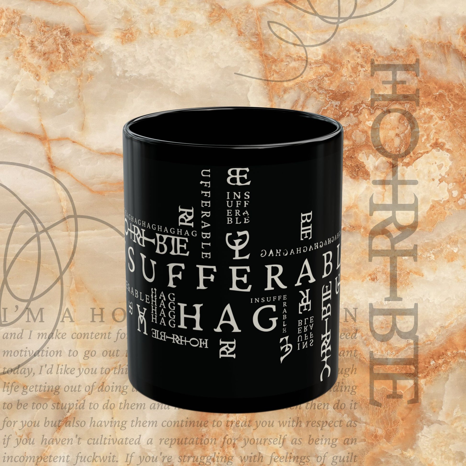 Design description: The Insufferable Hag collage is chaotic, featuring “INSUFFERABLE,” “HAG,” and “HORRIBLE” in bold letters, with different sizes and directions. “INSUFFERABLE” takes centre stage, while the other words crisscross, rotate, and even go upside down, giving off witchy energy.