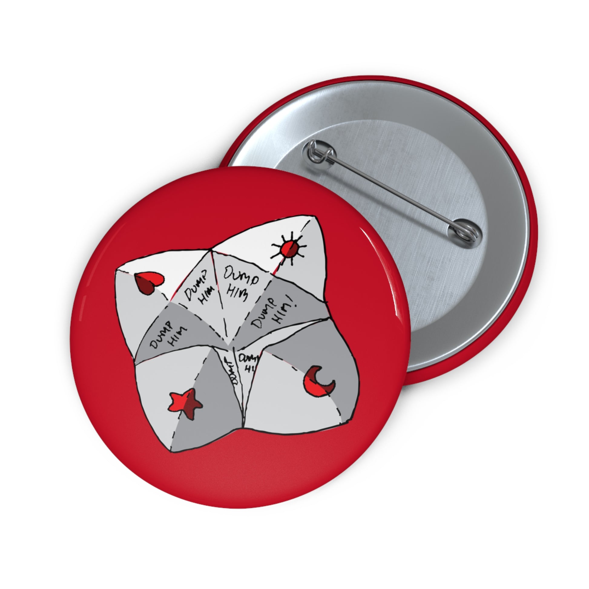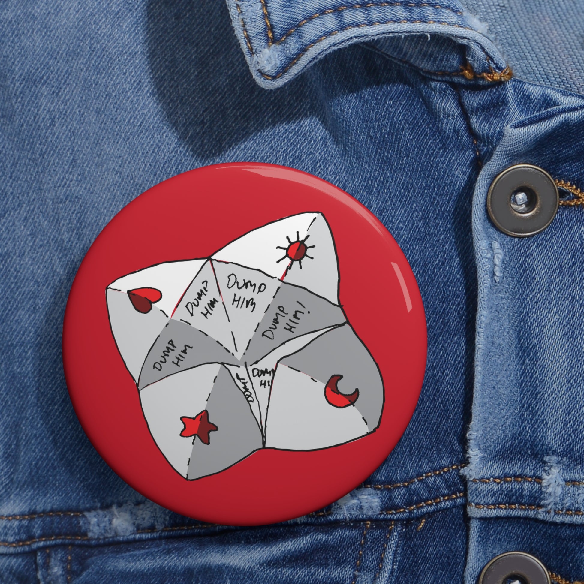 The Dump Him design is a hand-drawn, folded paper Chatter Box with sections shaded in grey, with each flap decorated with a red heart, star, crescent moon, or sun. Inside, every flap is filled with the handwritten advice “Dump Him” “Dump Him?” “Dump Him!”. The perfect pick if you have hard decisions ahead.