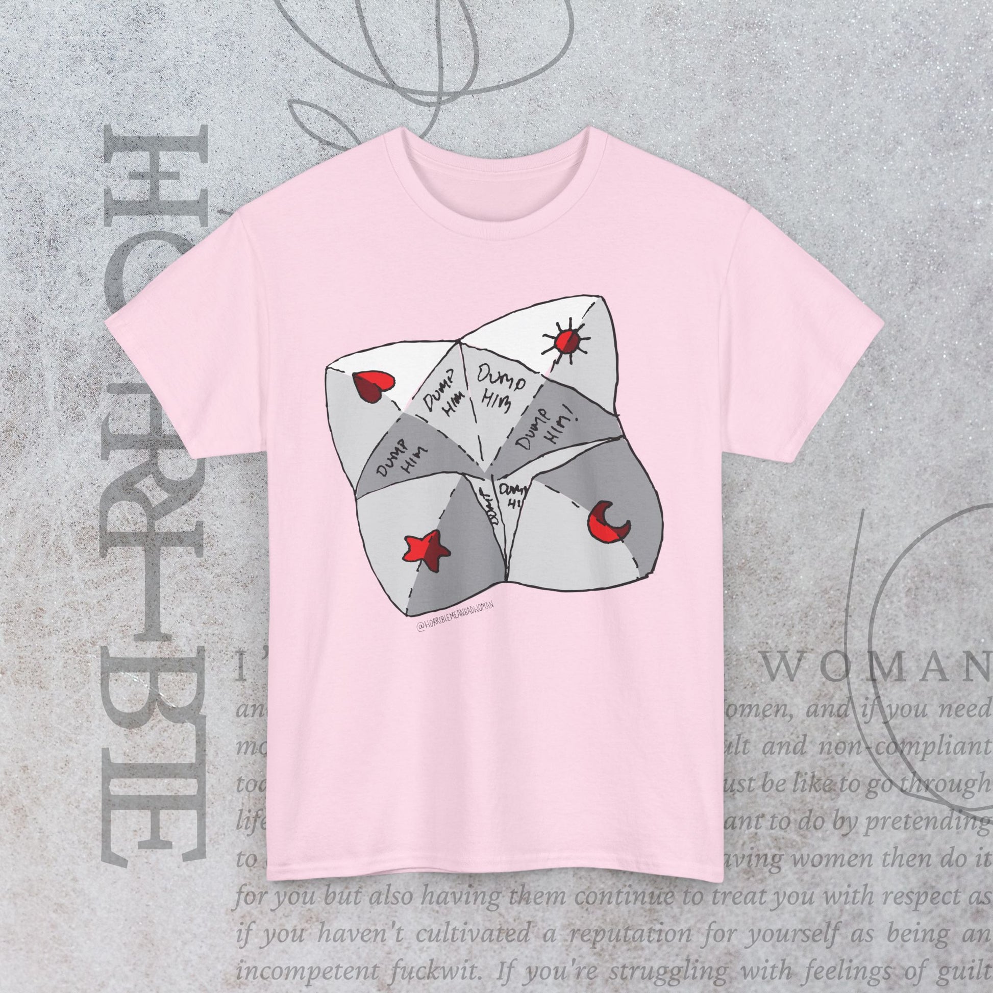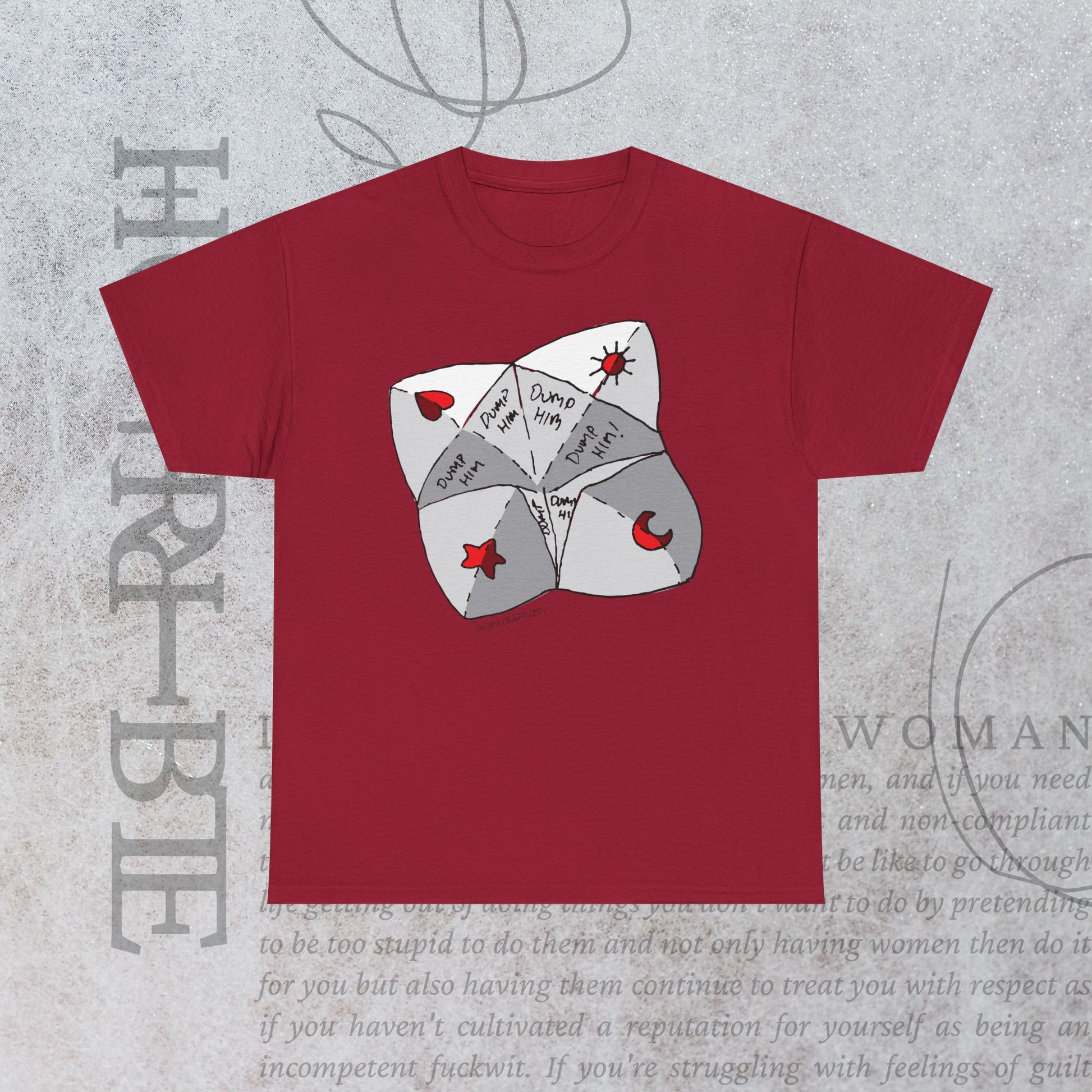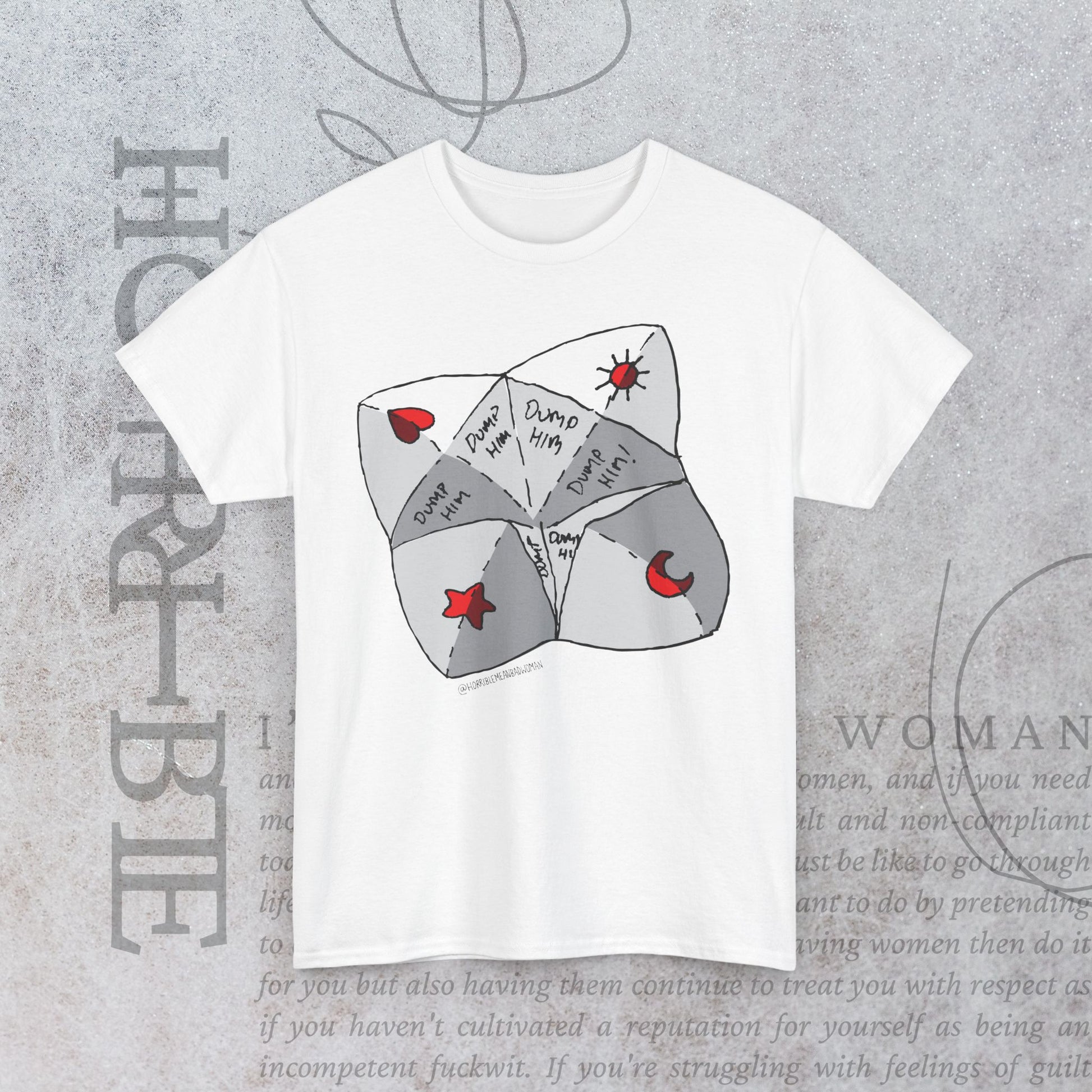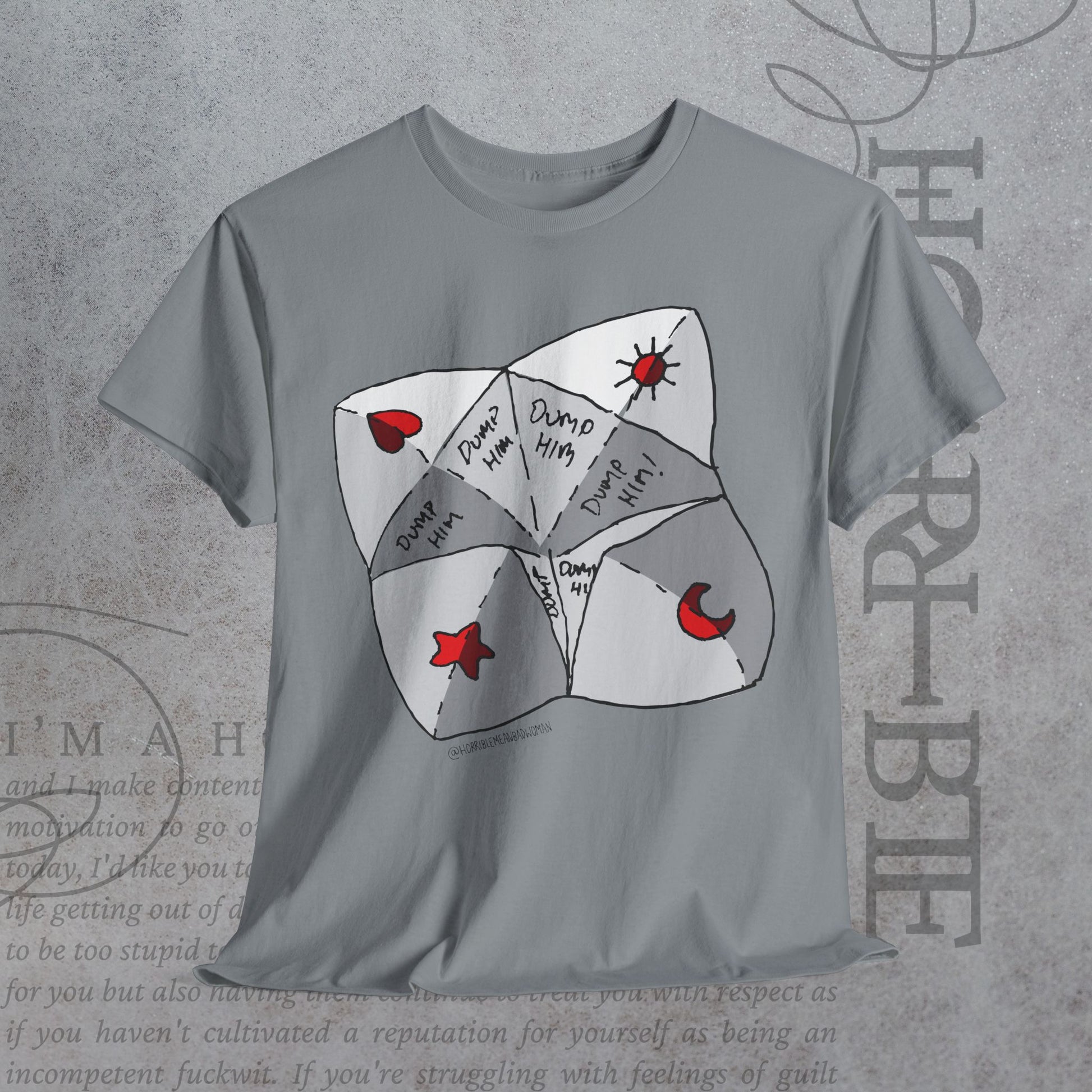 The Dump Him design is a hand-drawn, folded paper Chatter Box with sections shaded in grey, with each flap decorated with a red heart, star, crescent moon, or sun. Inside, every flap is filled with the handwritten advice “Dump Him” “Dump Him?” “Dump Him!”. The perfect pick if you have hard decisions ahead.