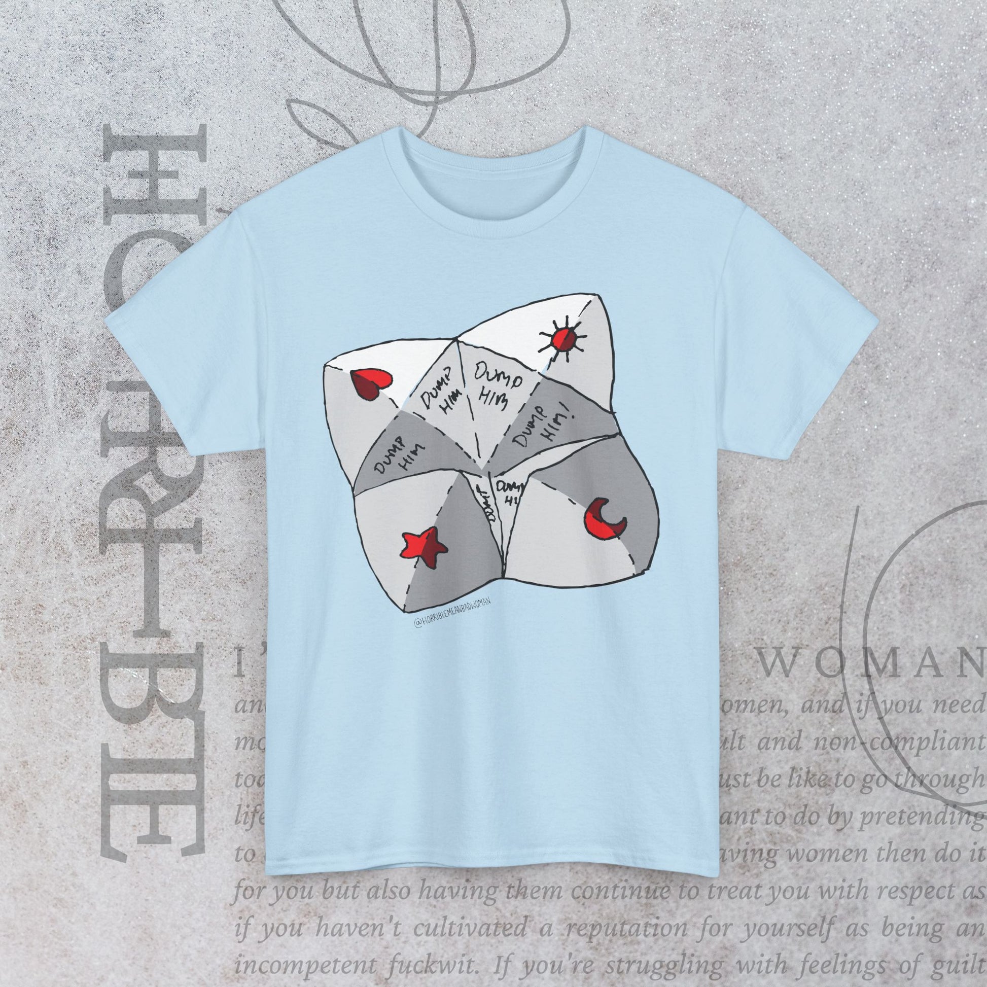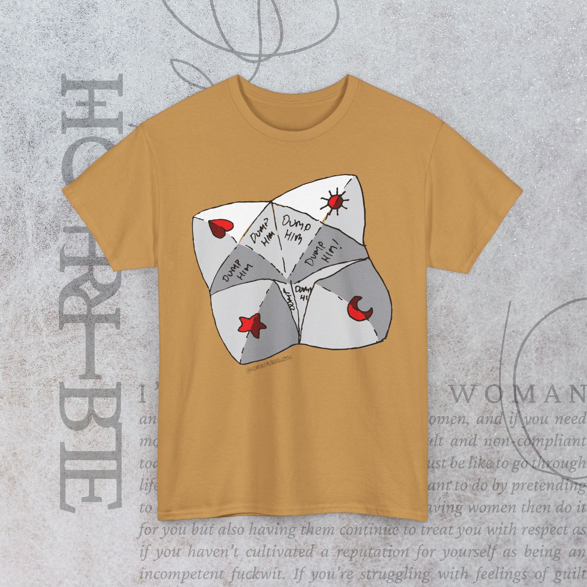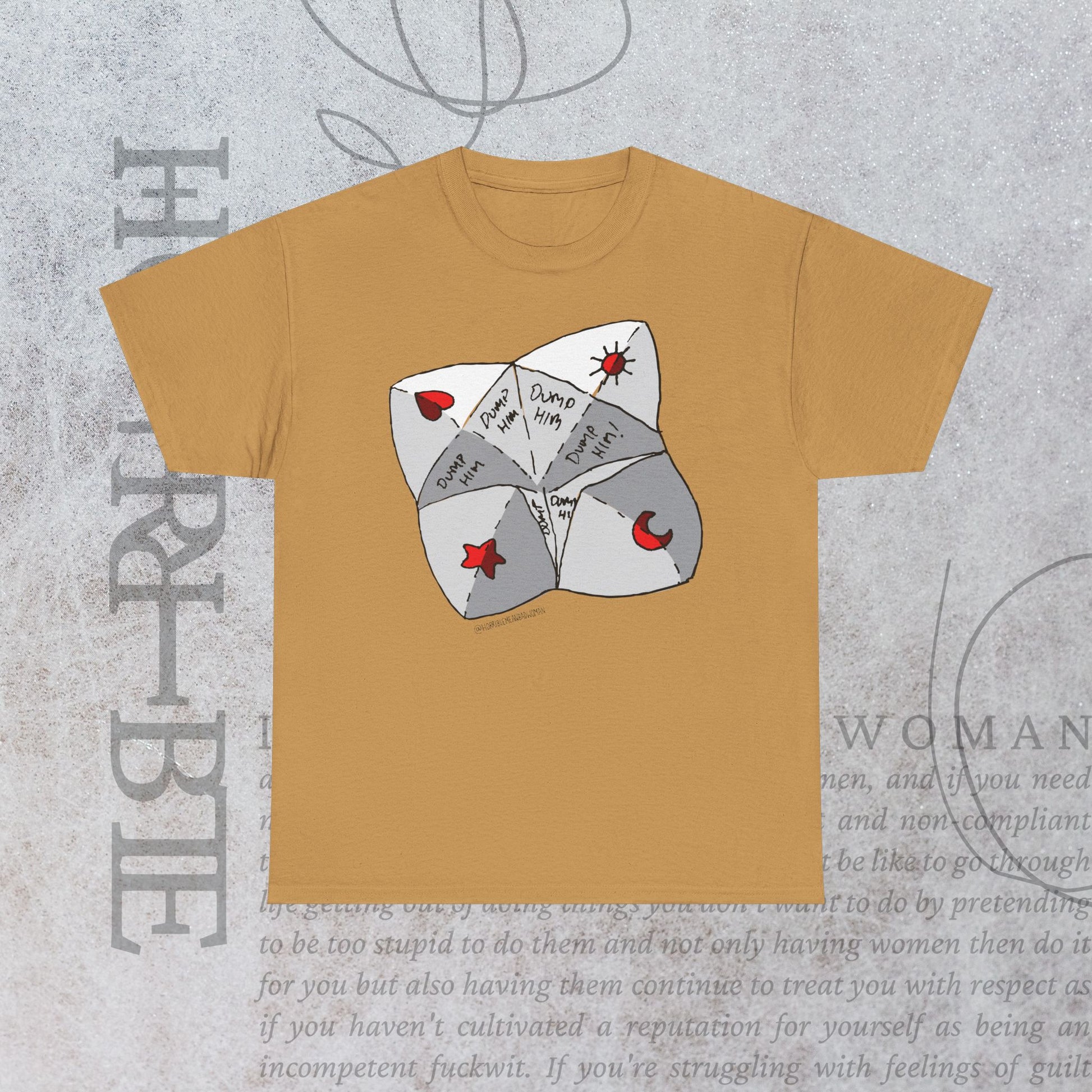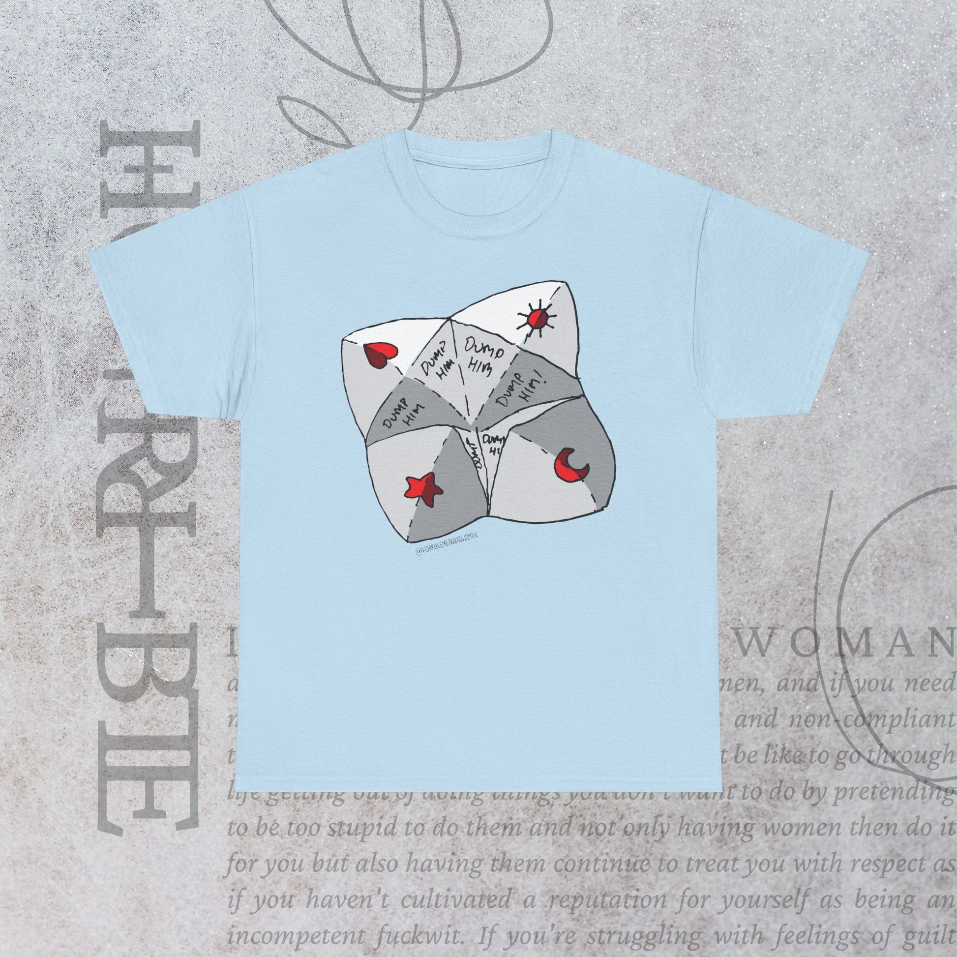 The Dump Him design is a hand-drawn, folded paper Chatter Box with sections shaded in grey, with each flap decorated with a red heart, star, crescent moon, or sun. Inside, every flap is filled with the handwritten advice “Dump Him” “Dump Him?” “Dump Him!”. The perfect pick if you have hard decisions ahead.