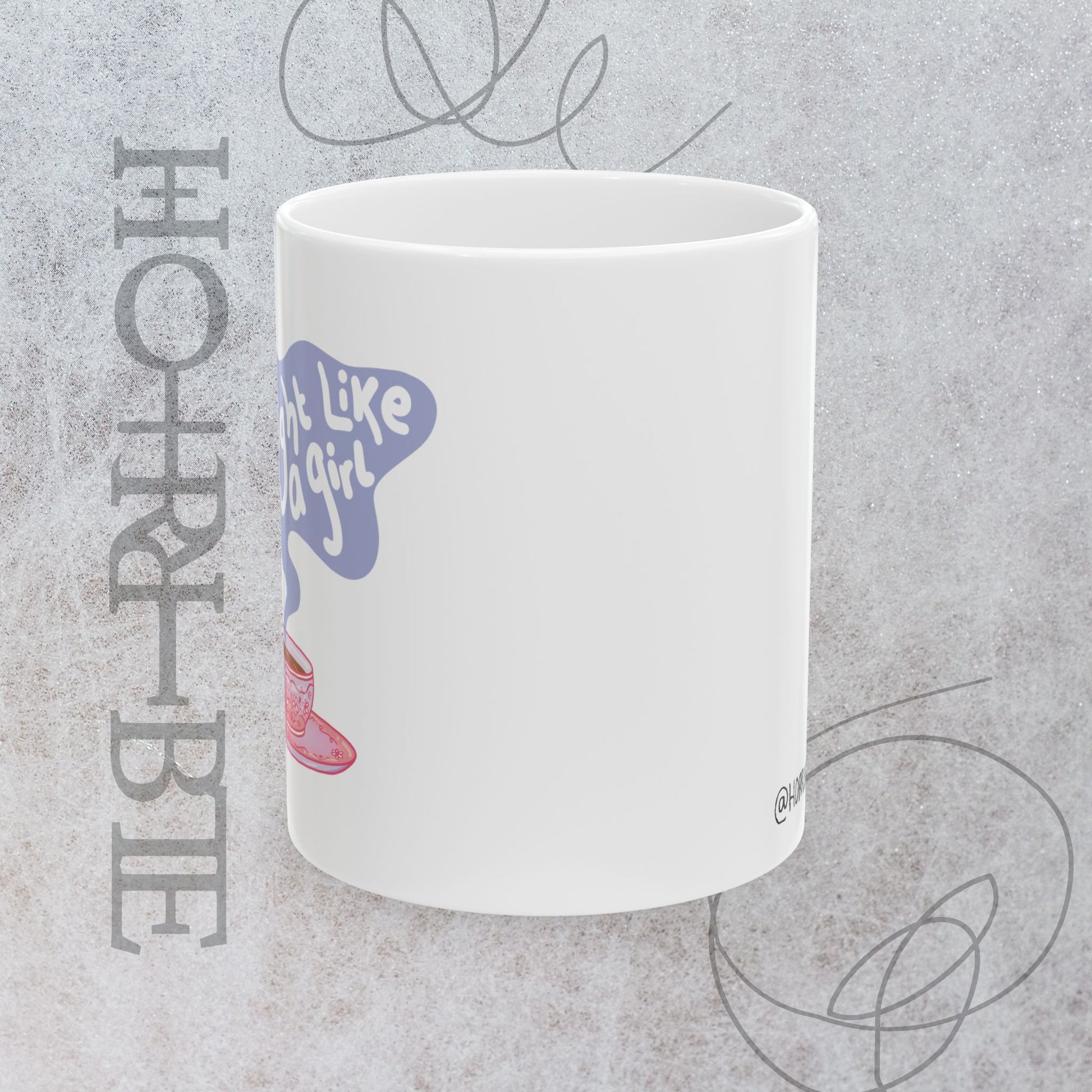 Design description: The Fight Like a Girl design is playful, featuring a vintage pink teacup and saucer with delicate floral designs, filled with looming tea. Next to the cup sits a glass bottle filled with a pink liquid, decorated with a skull and crossbones, giving off a sweet poison vibe. Rising from the cup, purple steam spells out “Fight Like a Girl” in bold, hand-drawn letters.
