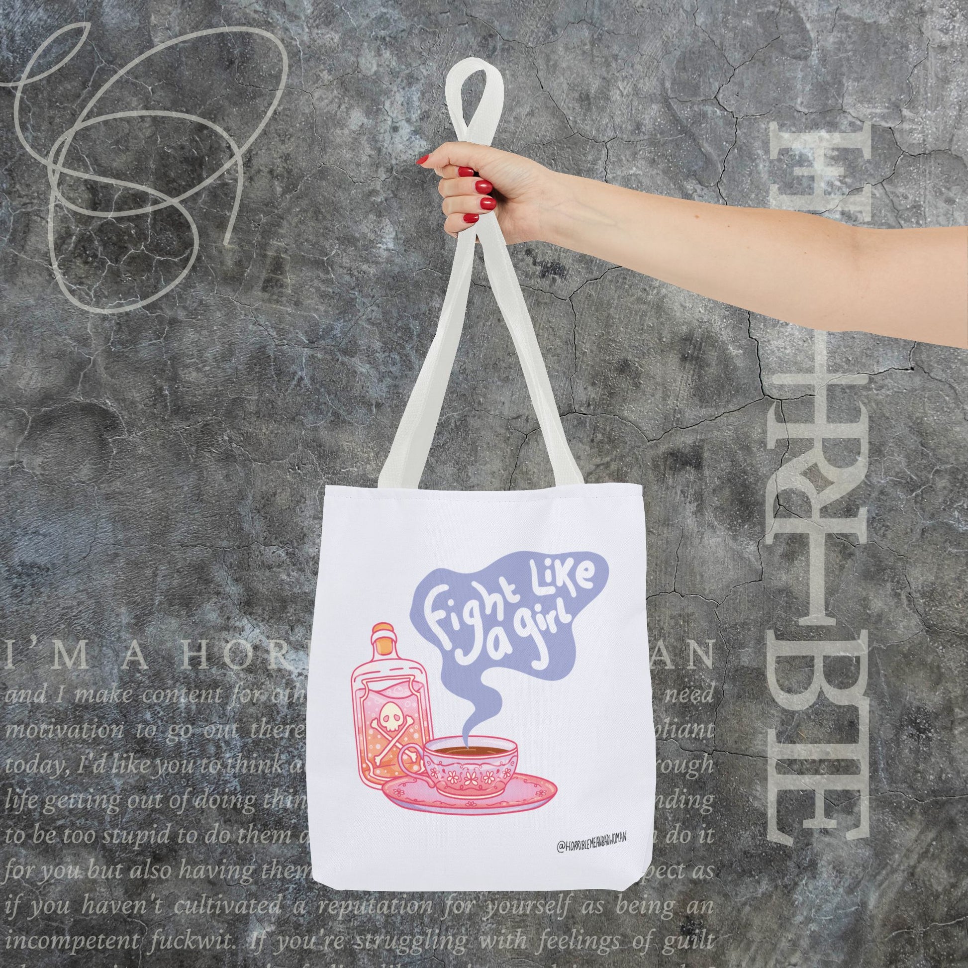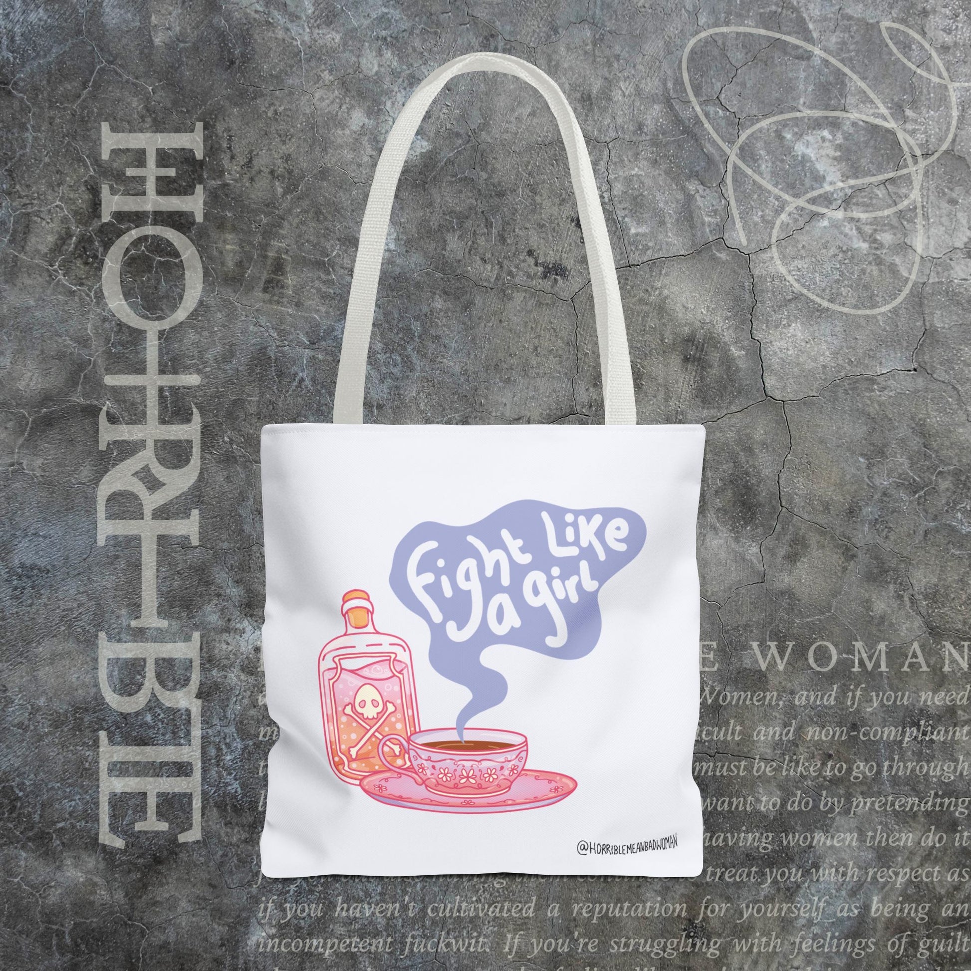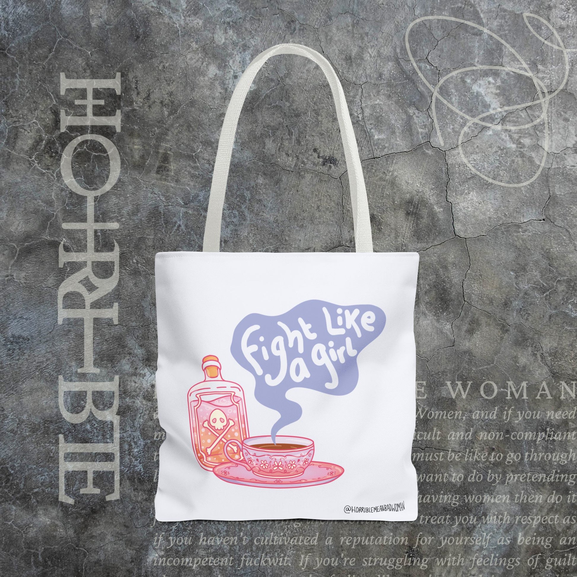Design description: The Fight Like a Girl design is playful, featuring a vintage pink teacup and saucer with delicate floral designs, filled with looming tea. Next to the cup sits a glass bottle filled with a pink liquid, decorated with a skull and crossbones, giving off a sweet poison vibe. Rising from the cup, purple steam spells out “Fight Like a Girl” in bold, hand-drawn letters. Designed by Sarah @horriblemeanbadwoman in Perth, Australia. About Sarah: Sarah is a comedian, creator, artist, and soon-to-be published author that connects with women unapologetically across her socials.