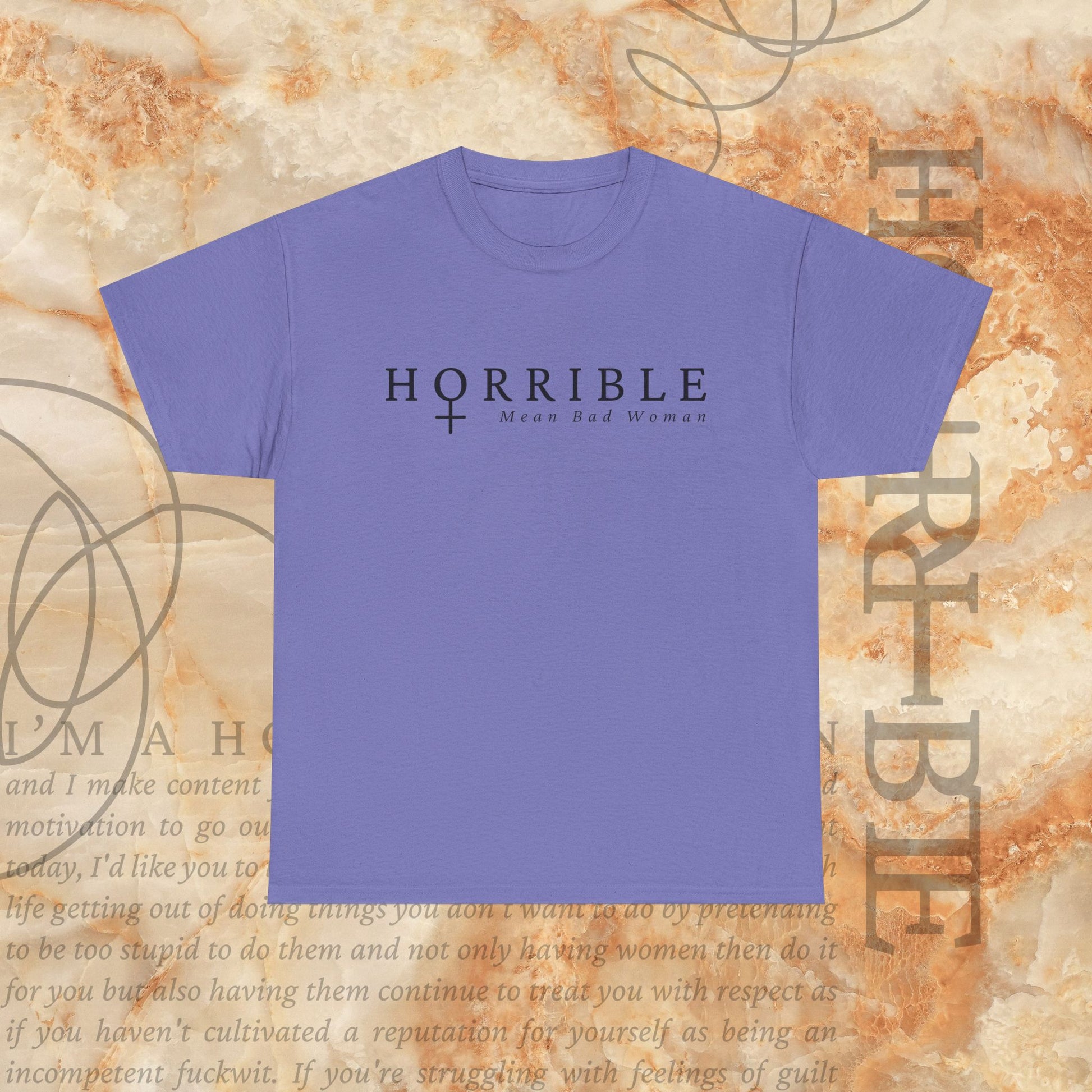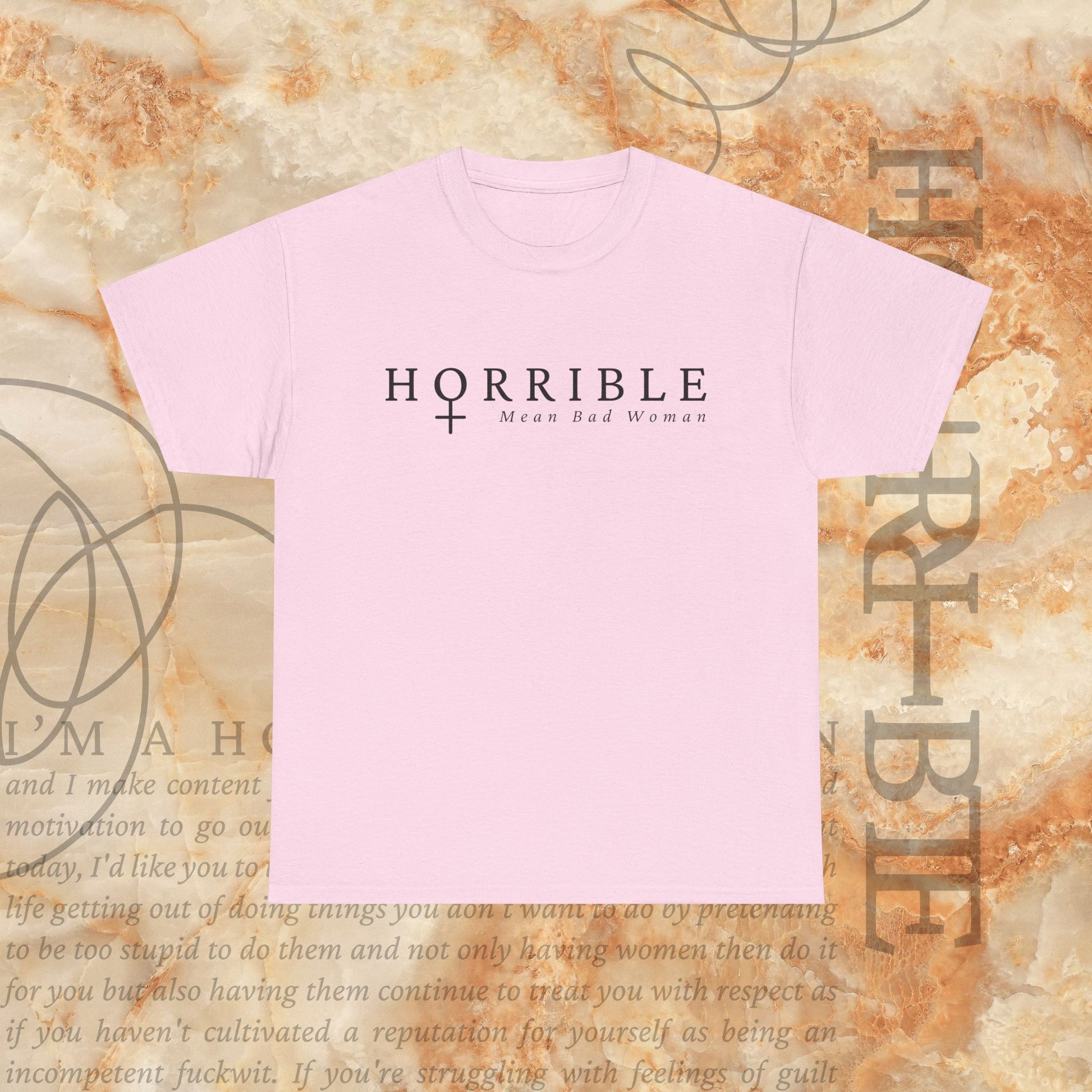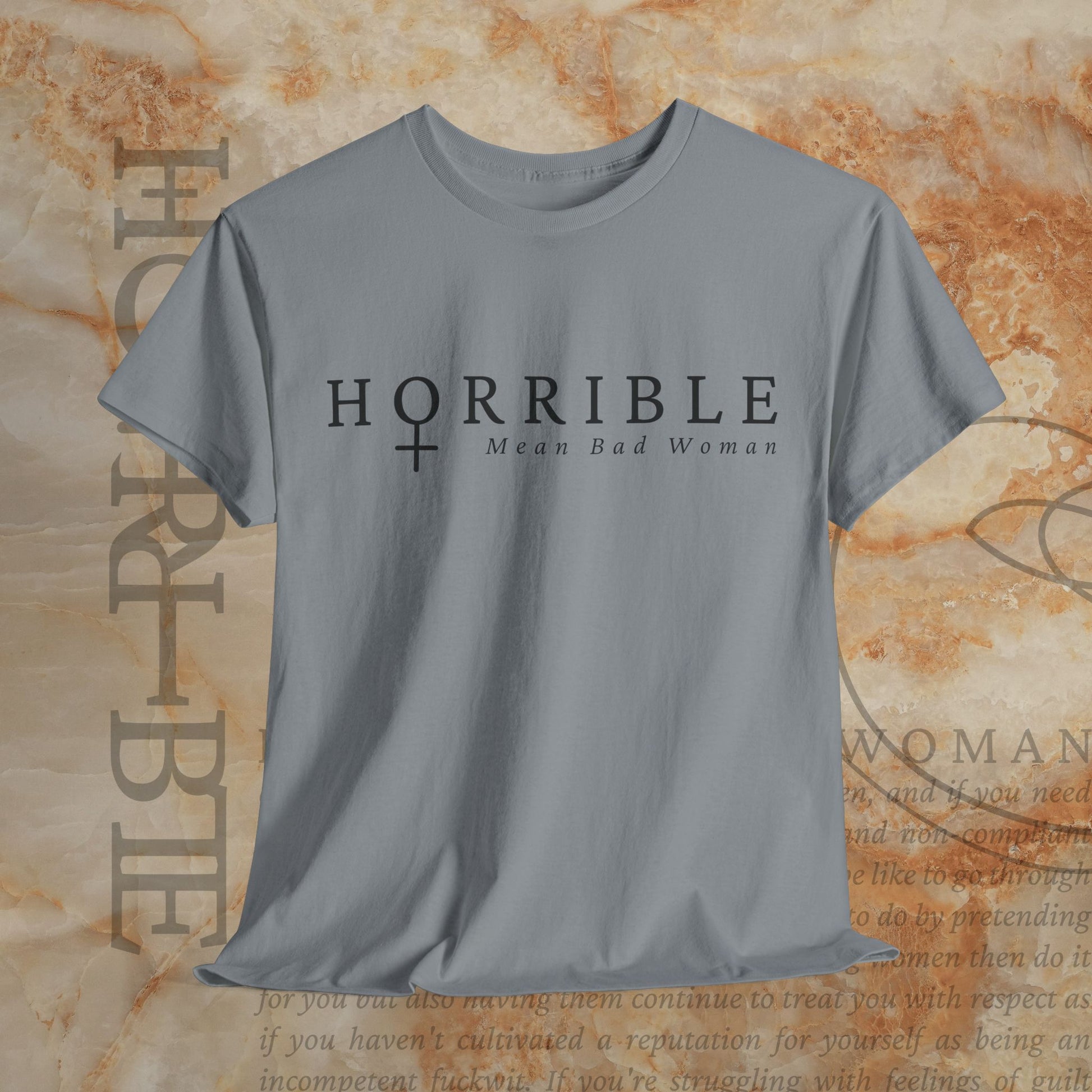 The straight to the point, original and iconic Horrible Mean Bad Woman logo on a tee that's easy to wear through all seasons, and super durable for many Horrible Activities.