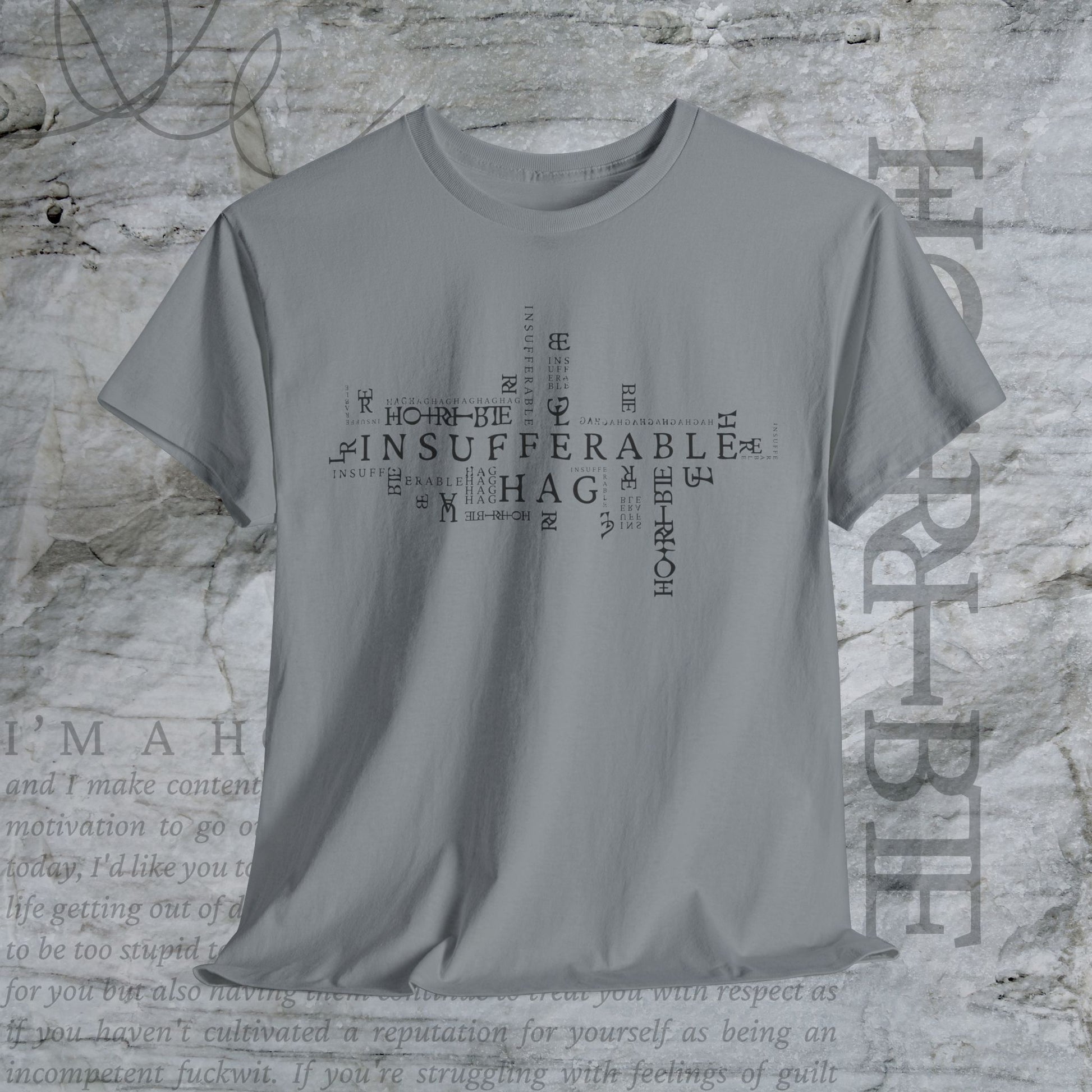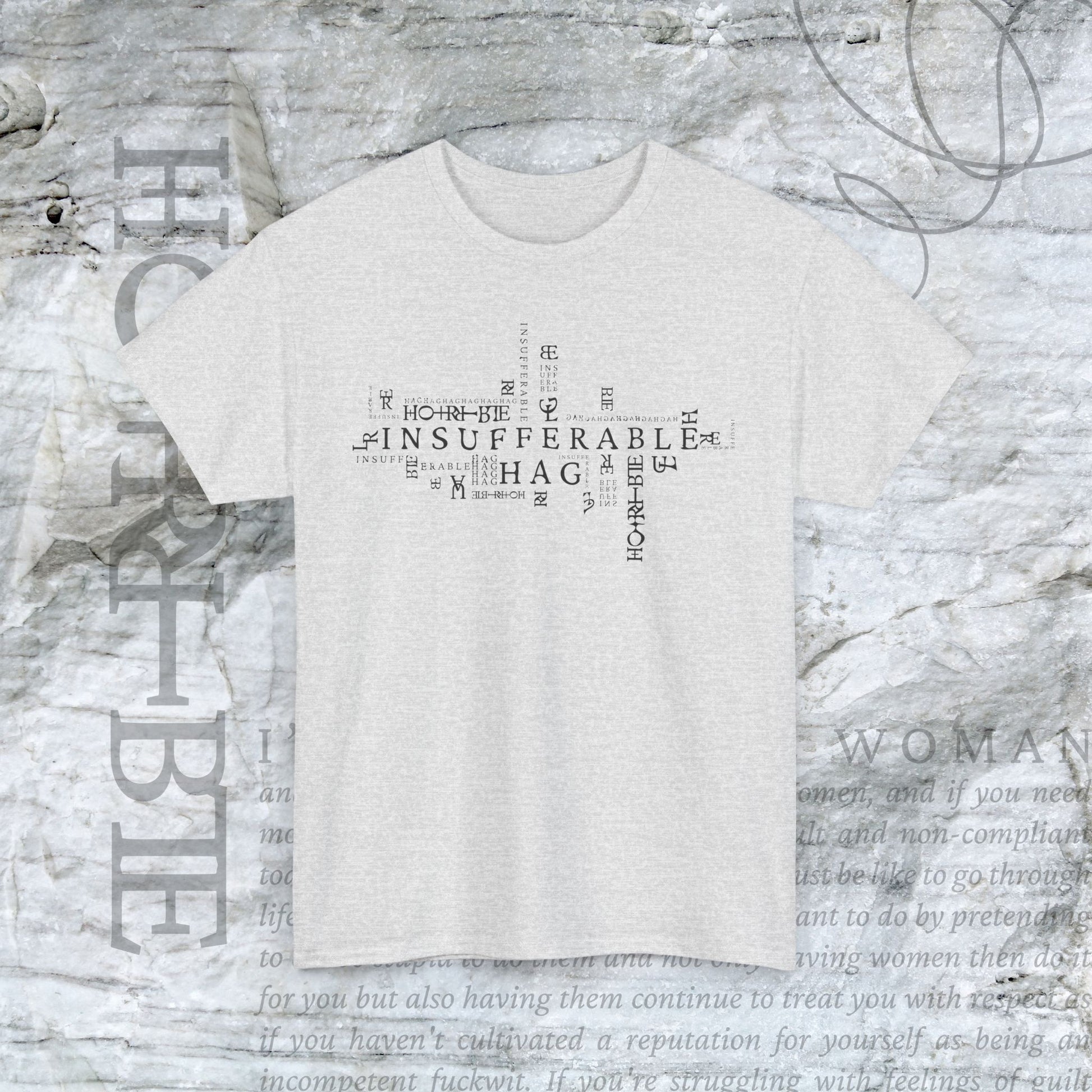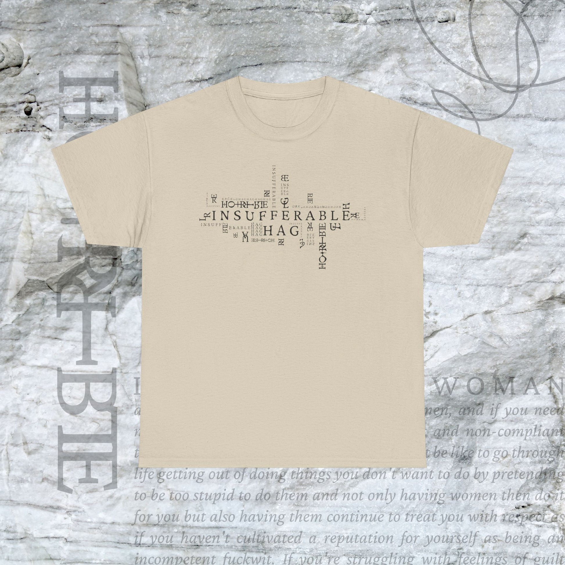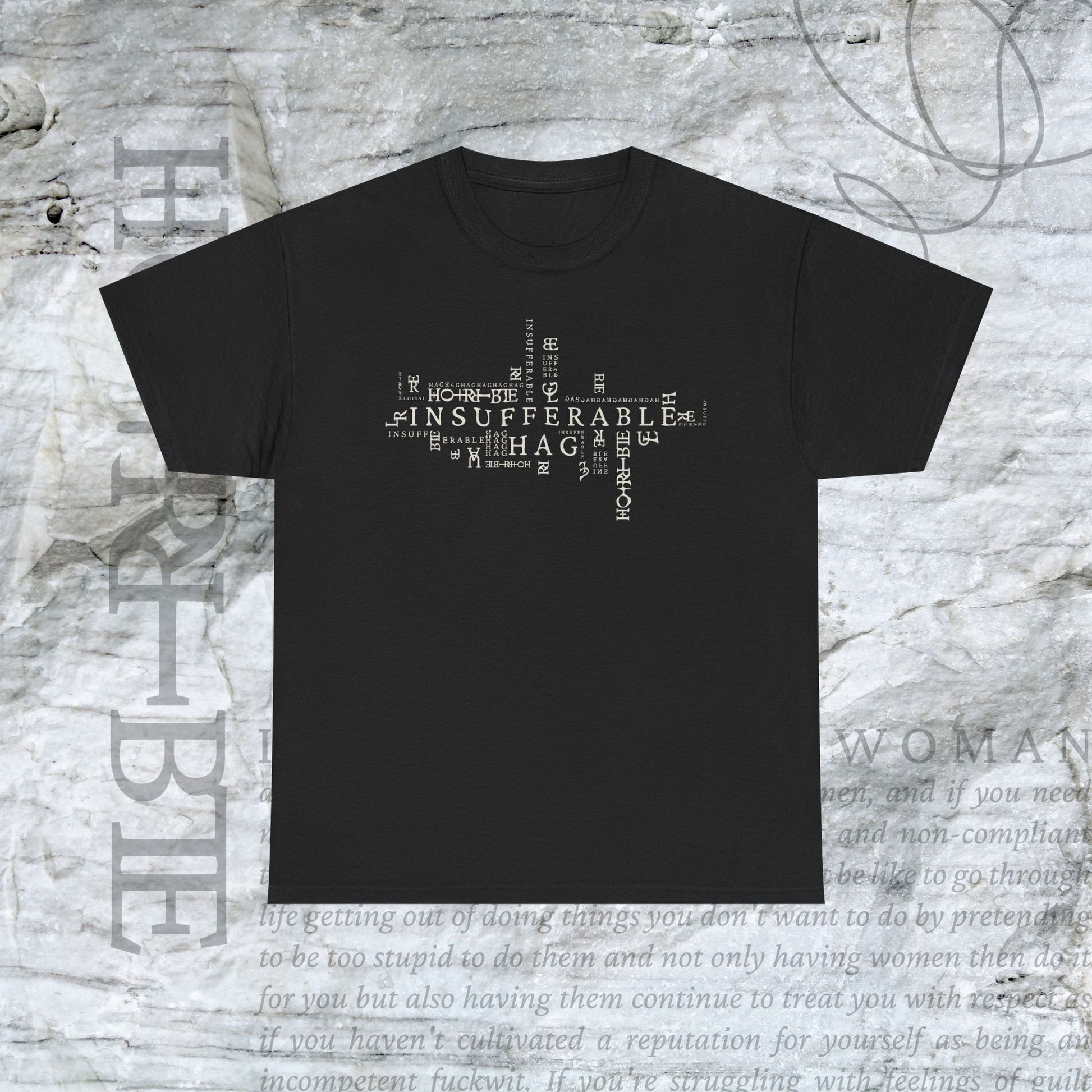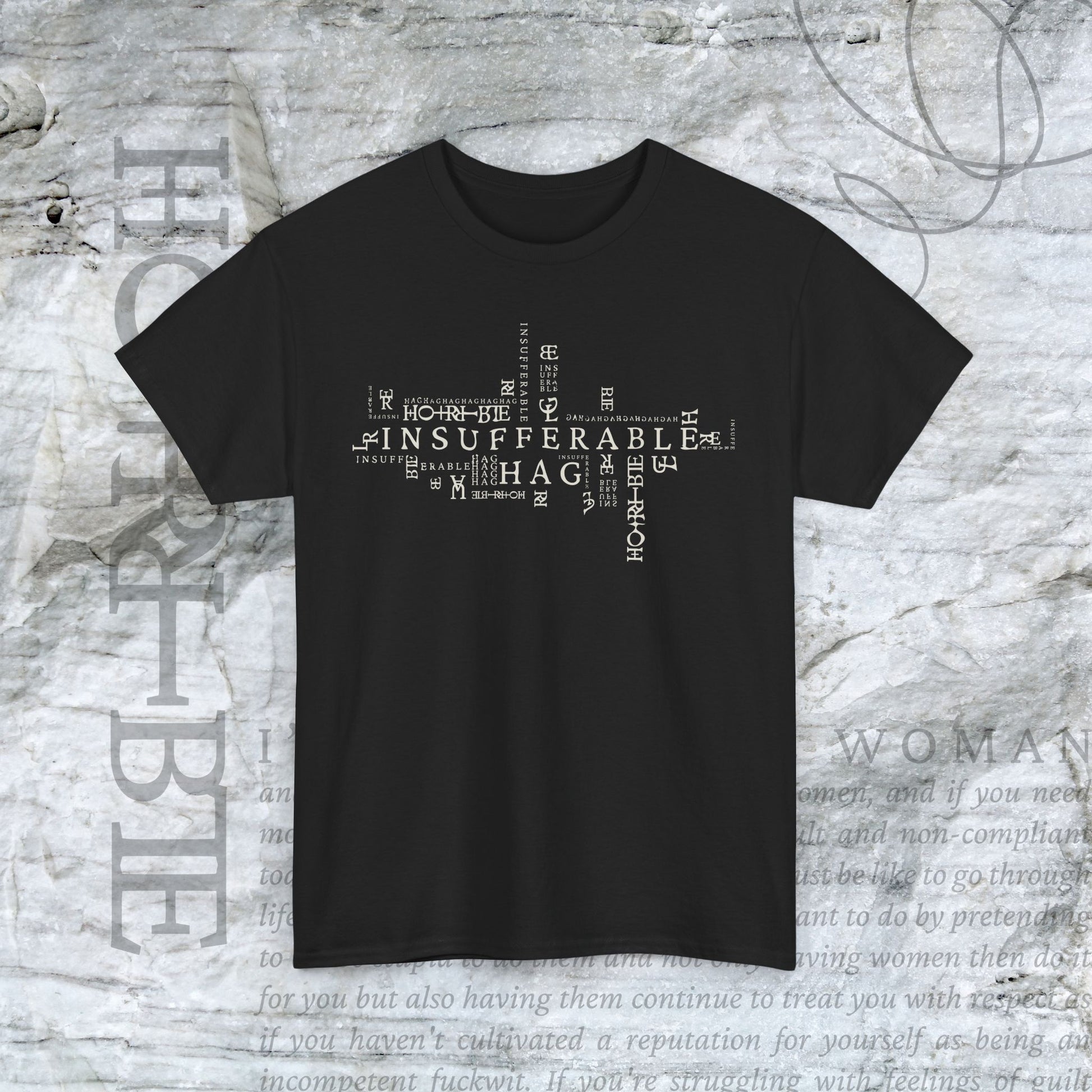 Design description: The Insufferable Hag collage is chaotic, featuring “INSUFFERABLE,” “HAG,” and “HORRIBLE” in bold letters, with different sizes and directions. “INSUFFERABLE” takes centre stage, while the other words crisscross, rotate, and even go upside down, giving off witchy energy.