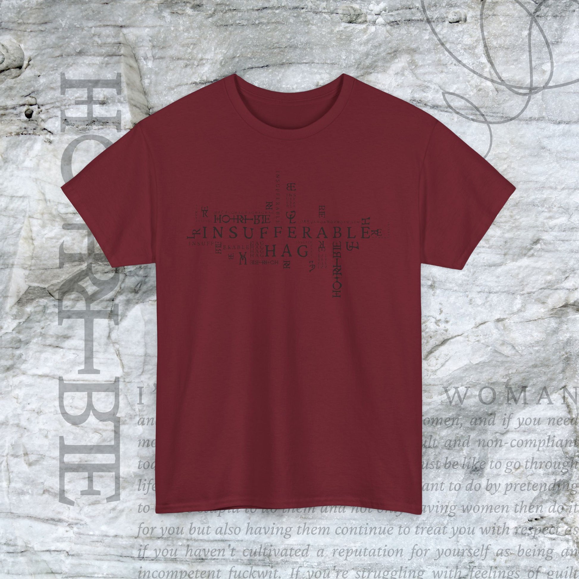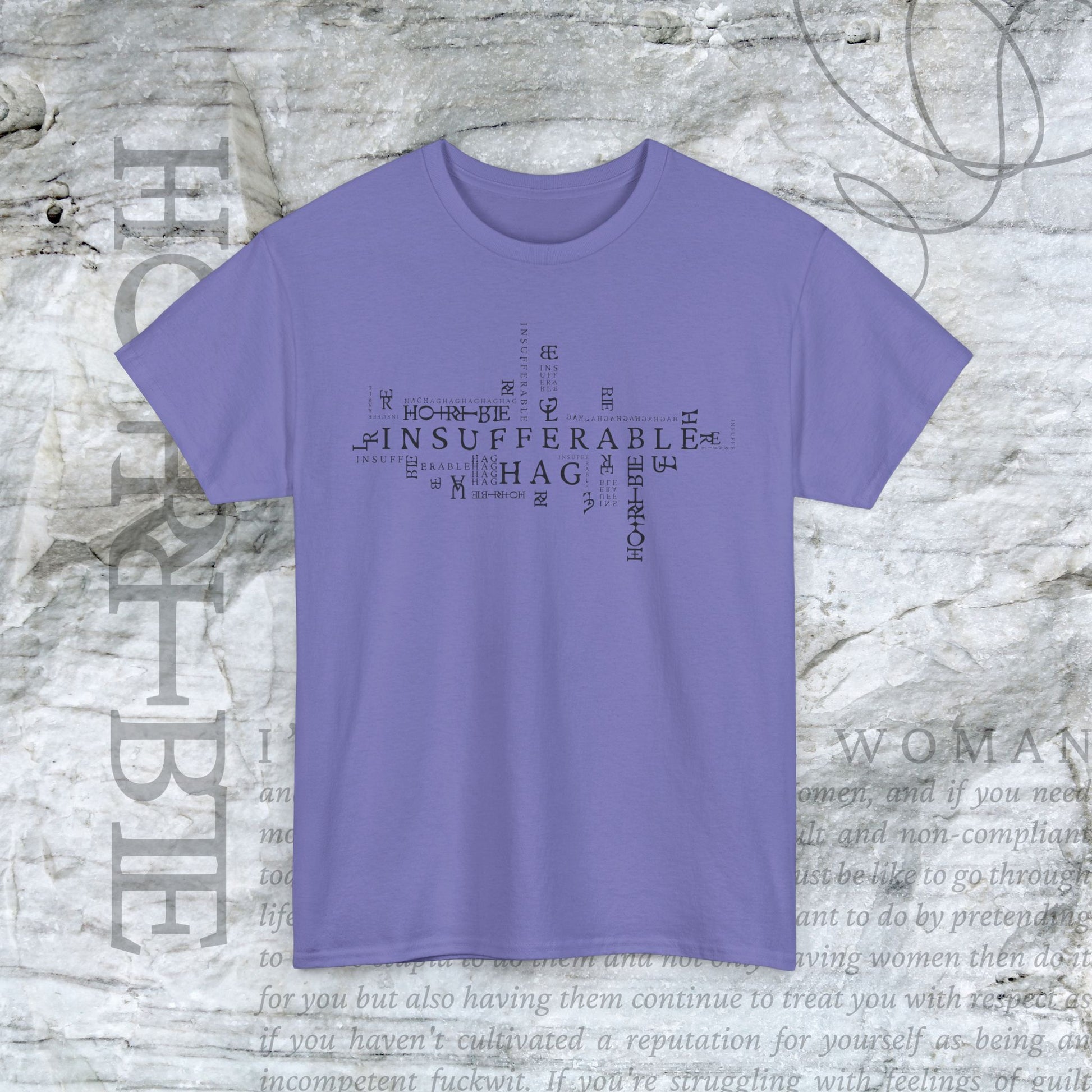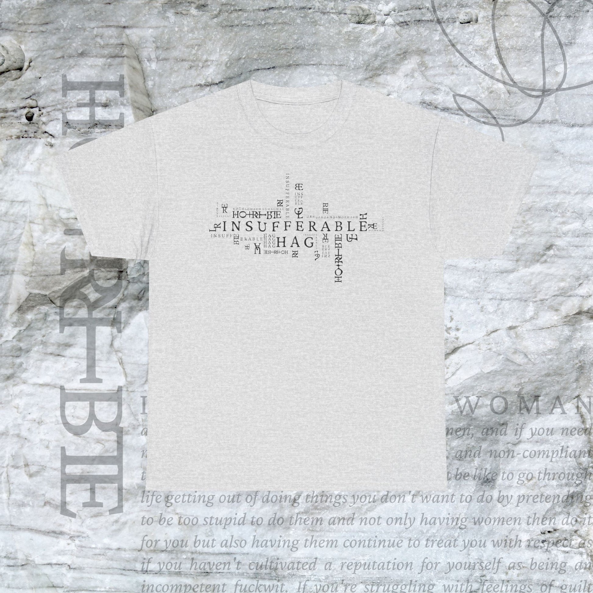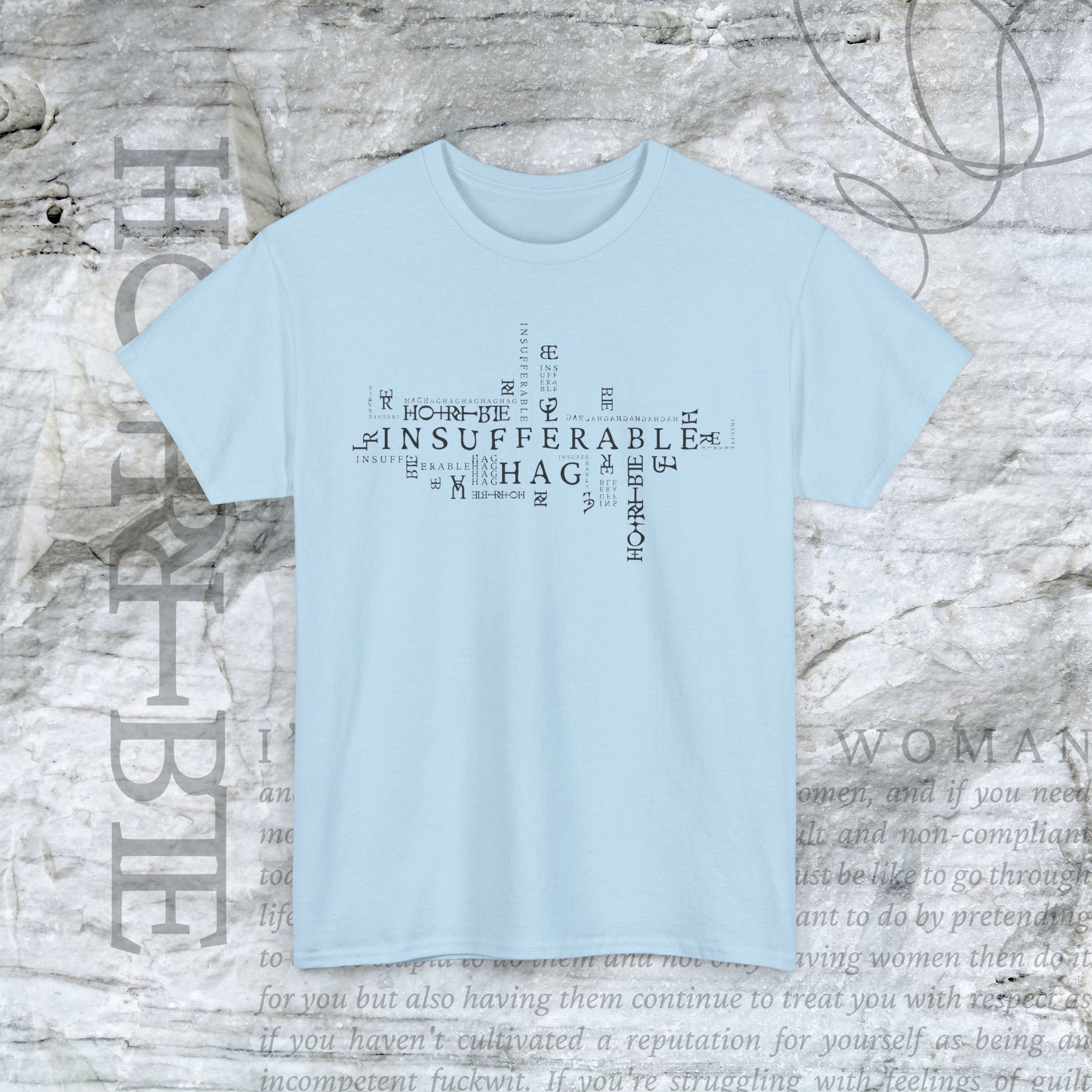 Design description: The Insufferable Hag collage is chaotic, featuring “INSUFFERABLE,” “HAG,” and “HORRIBLE” in bold letters, with different sizes and directions. “INSUFFERABLE” takes centre stage, while the other words crisscross, rotate, and even go upside down, giving off witchy energy.