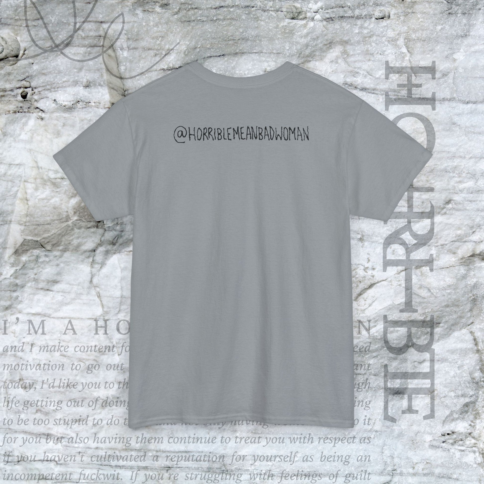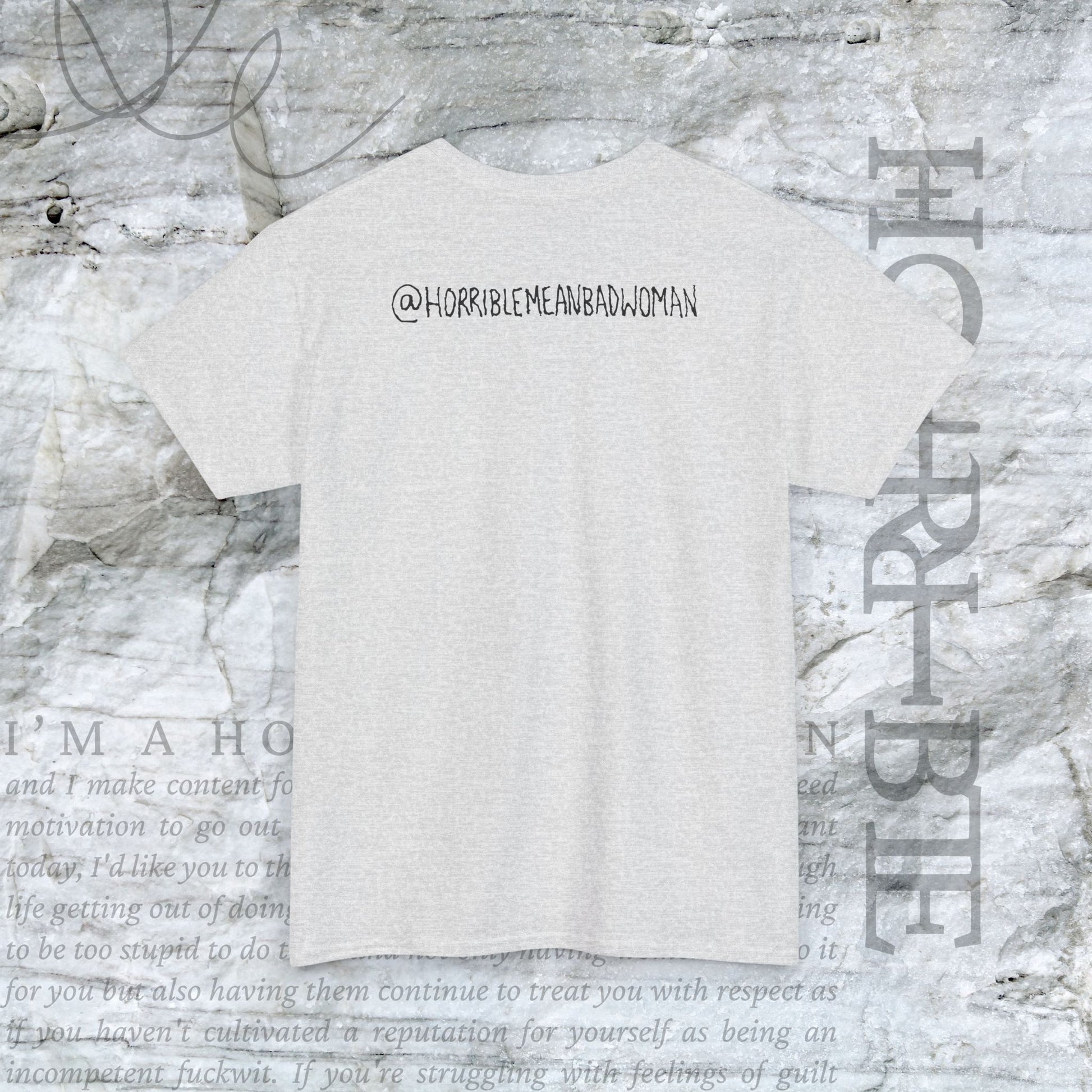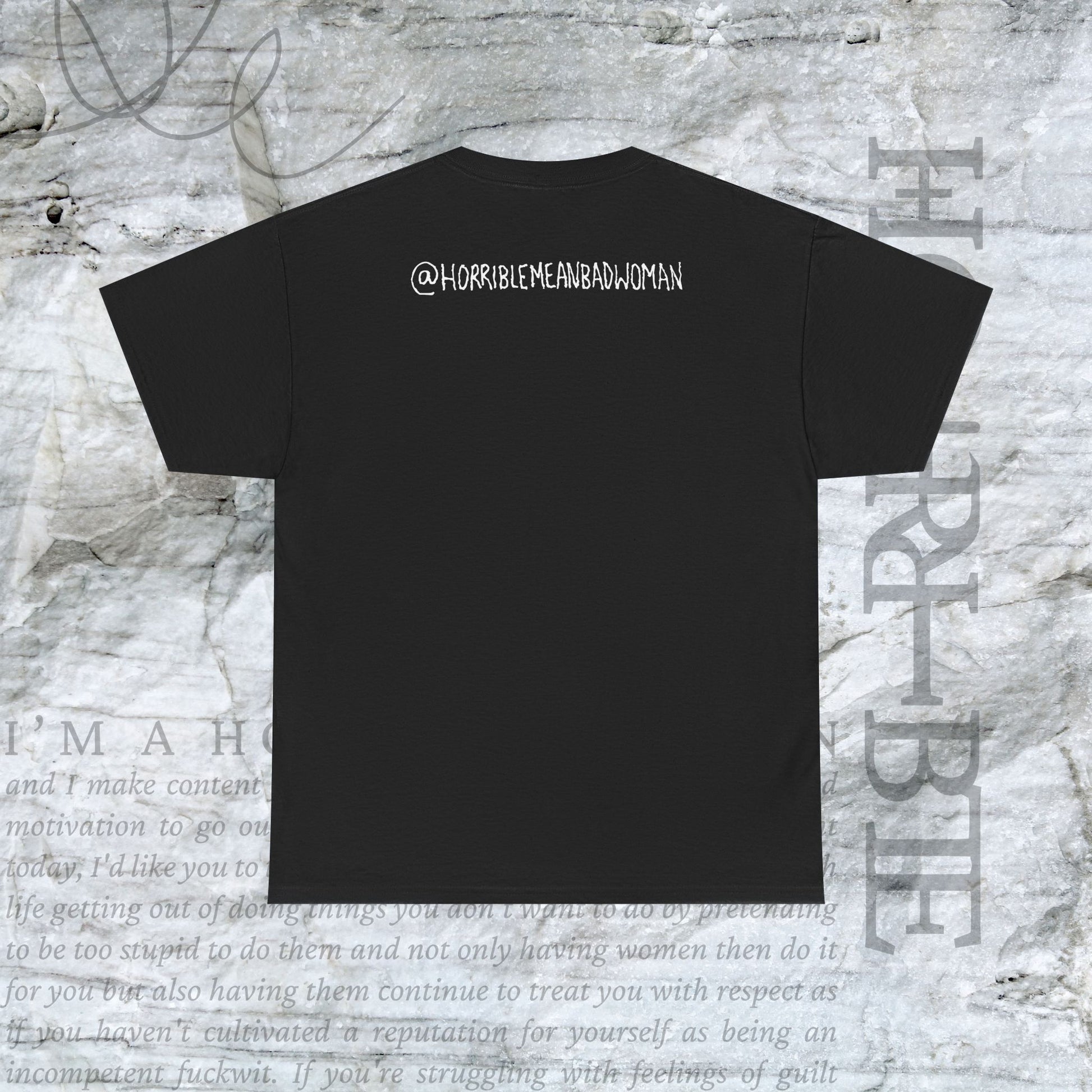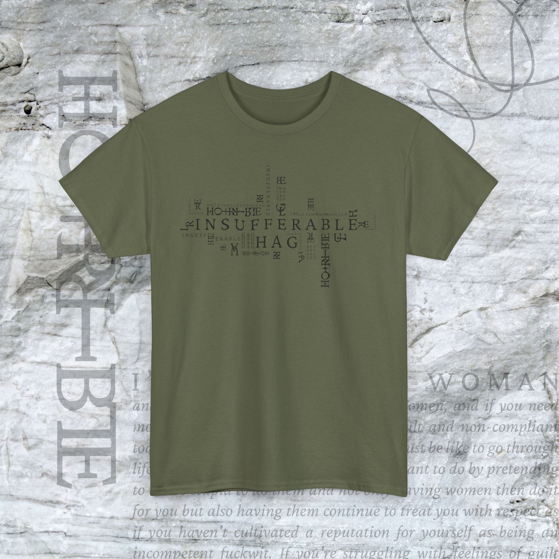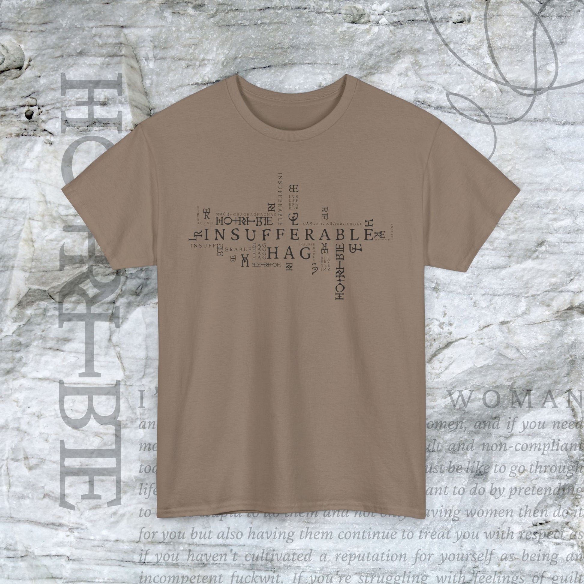 Design description: The Insufferable Hag collage is chaotic, featuring “INSUFFERABLE,” “HAG,” and “HORRIBLE” in bold letters, with different sizes and directions. “INSUFFERABLE” takes centre stage, while the other words crisscross, rotate, and even go upside down, giving off witchy energy.