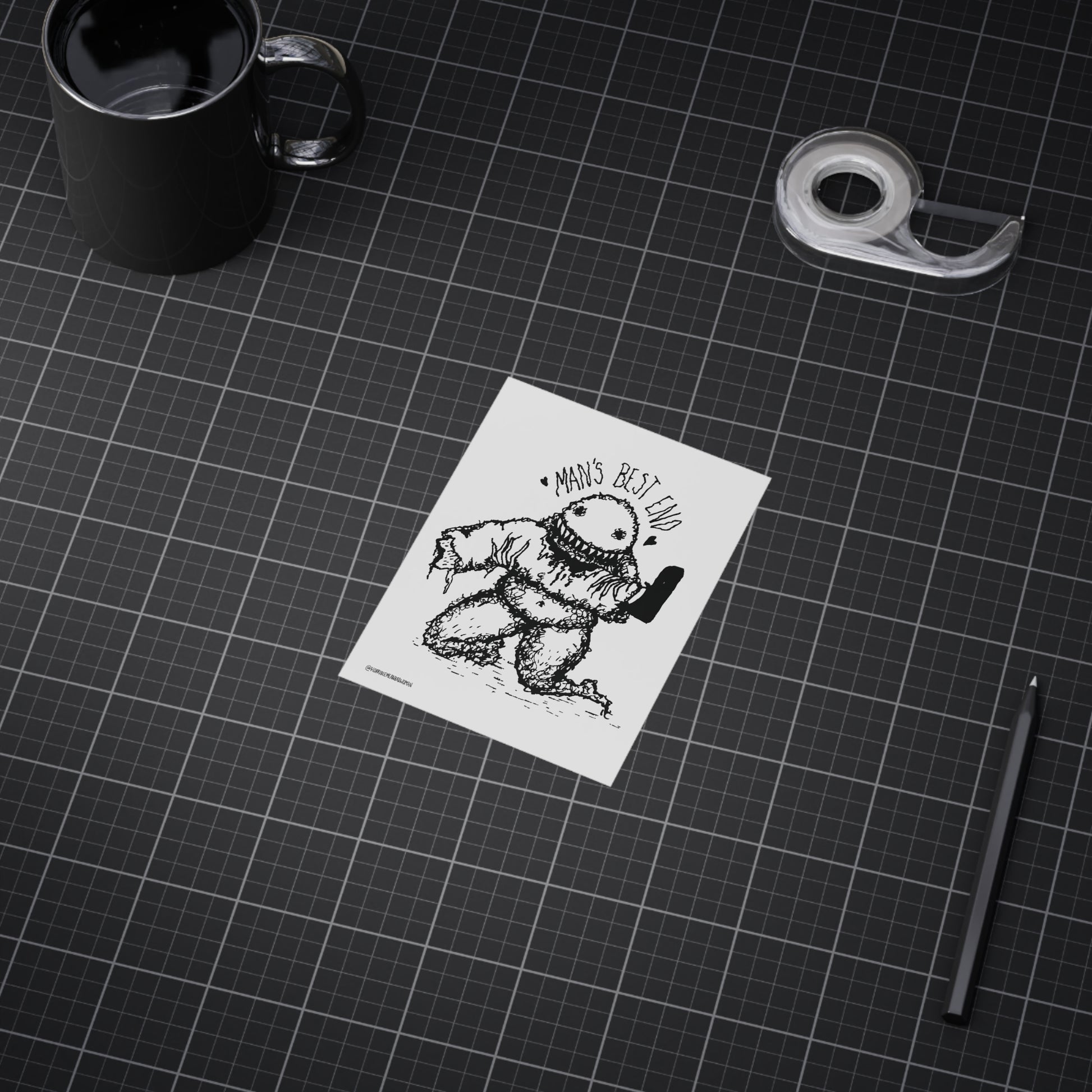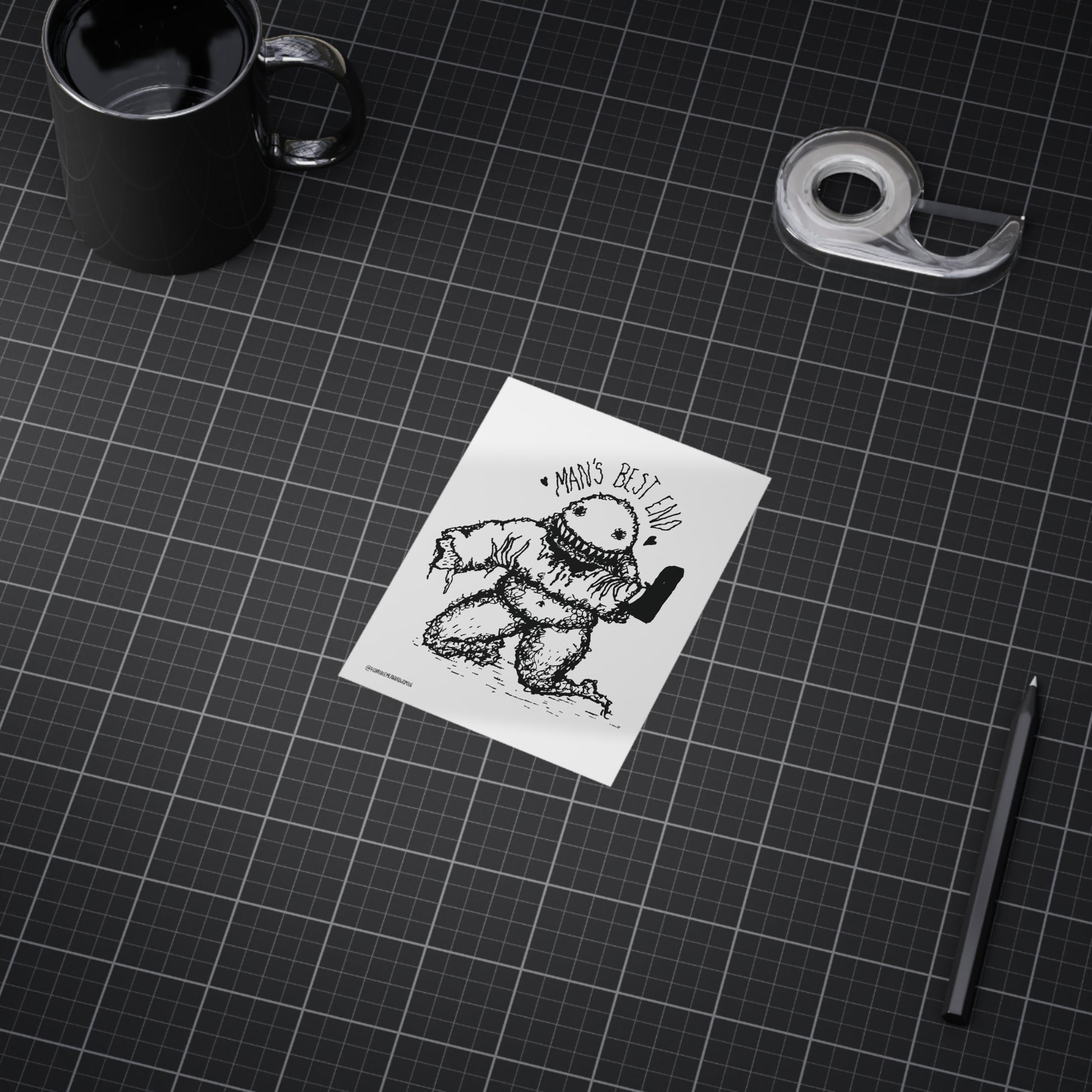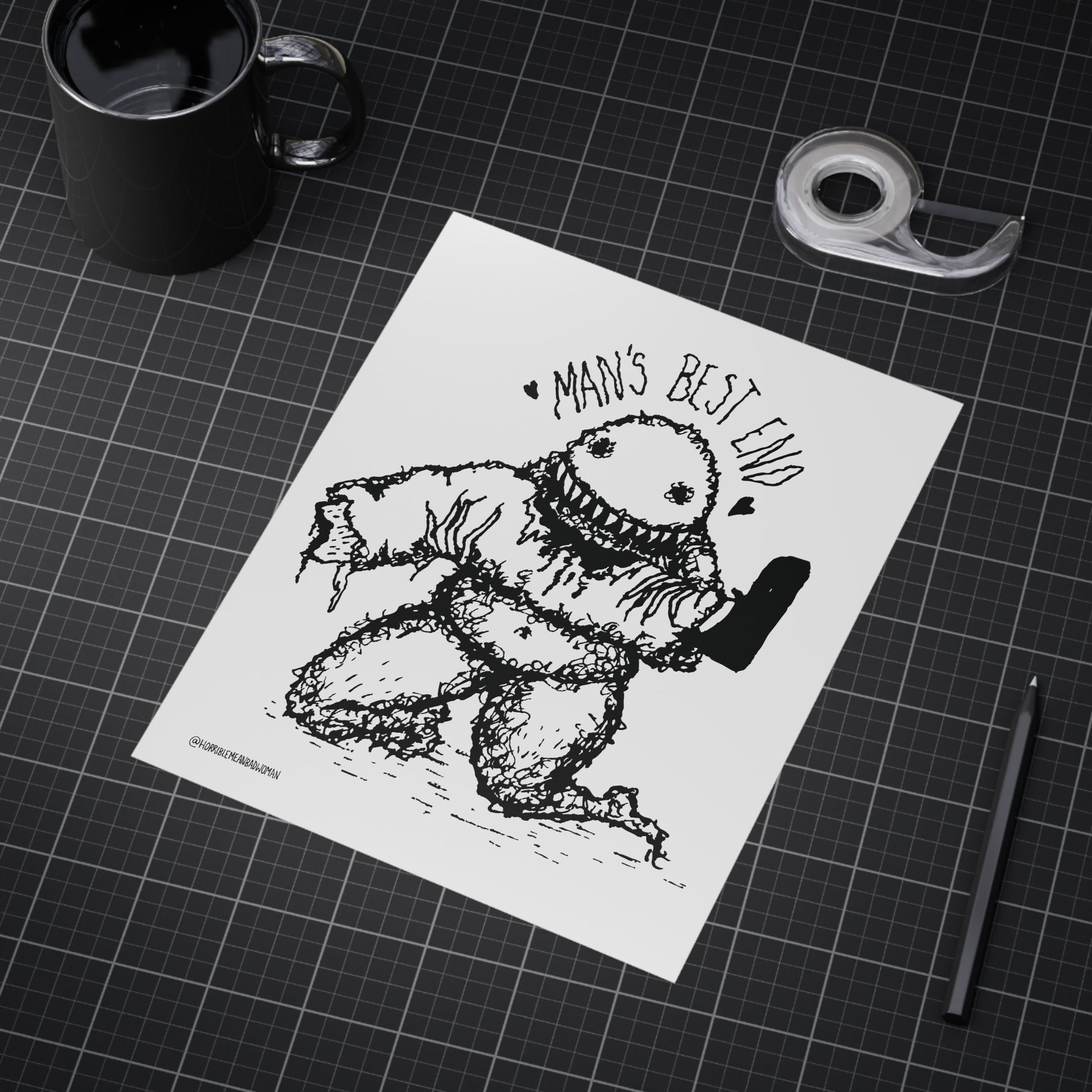 Design description: The Man’s Best End design is fuzzy, moody, and sparks joy into dark hearts. A large and sharp teeth filled smile is millimetres away from sinking into a man’s leg, as our monster is ready to chomp. The words “MAN’S BEST END” stretched vertically in black, uppercase letters sit on top of the scene, bookended by two little black hearts. This design will scare most children.