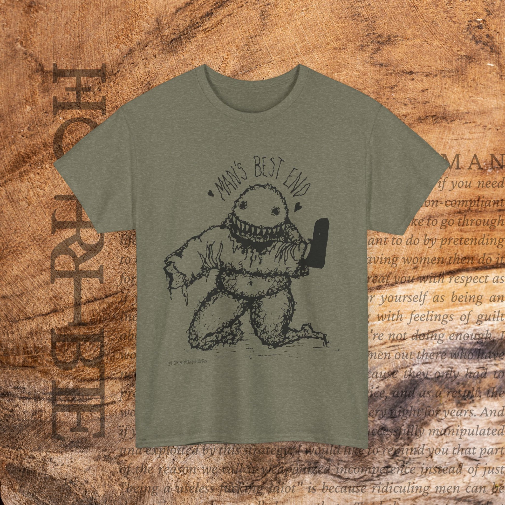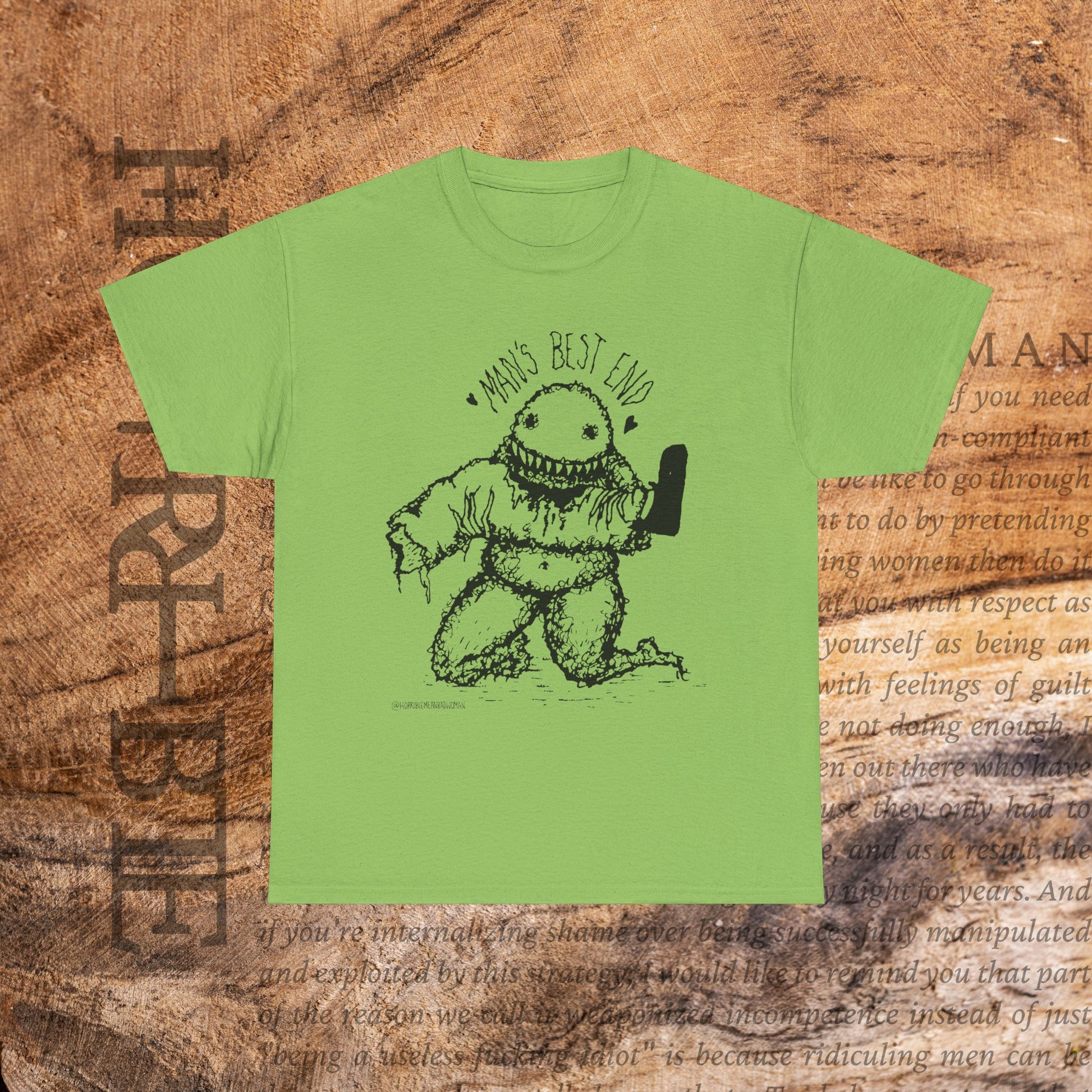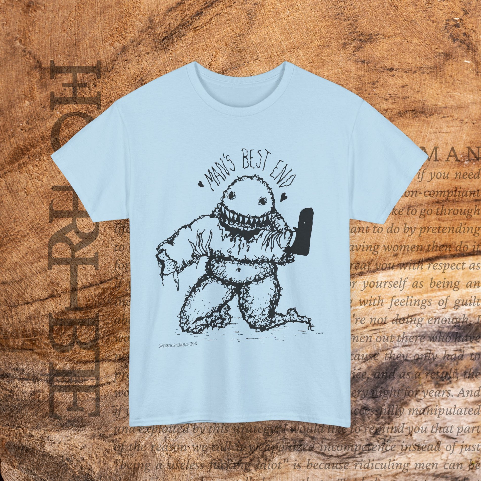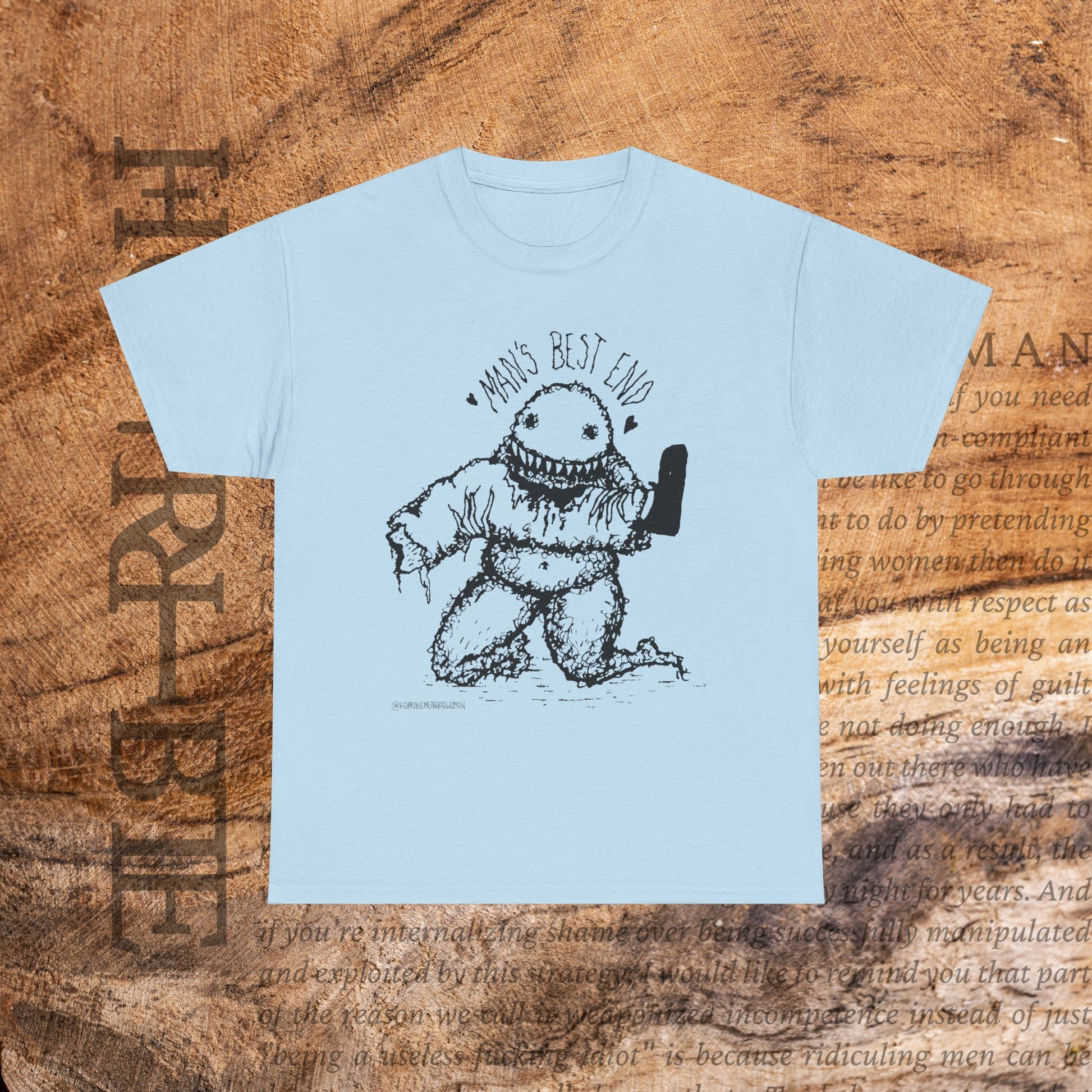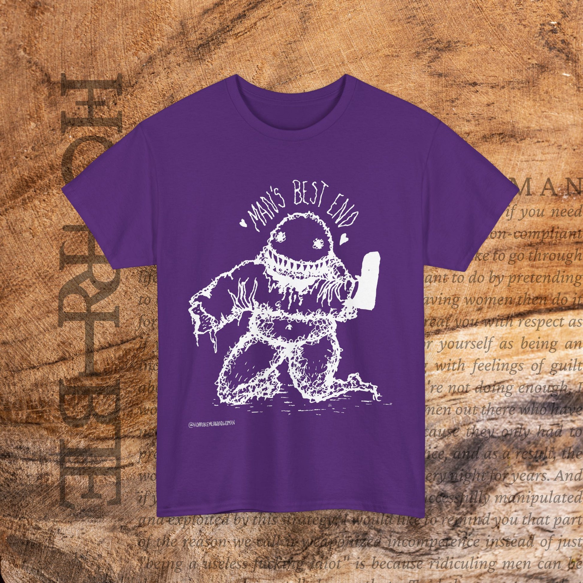 Design description: The Man’s Best End design is fuzzy, moody, and sparks joy into dark hearts. A large and sharp teeth filled smile is millimetres away from sinking into a man’s leg, as our monster is ready to chomp. The words “MAN’S BEST END” stretched vertically in black, uppercase letters sit on top of the scene, bookended by two little black hearts. This design will scare most children.