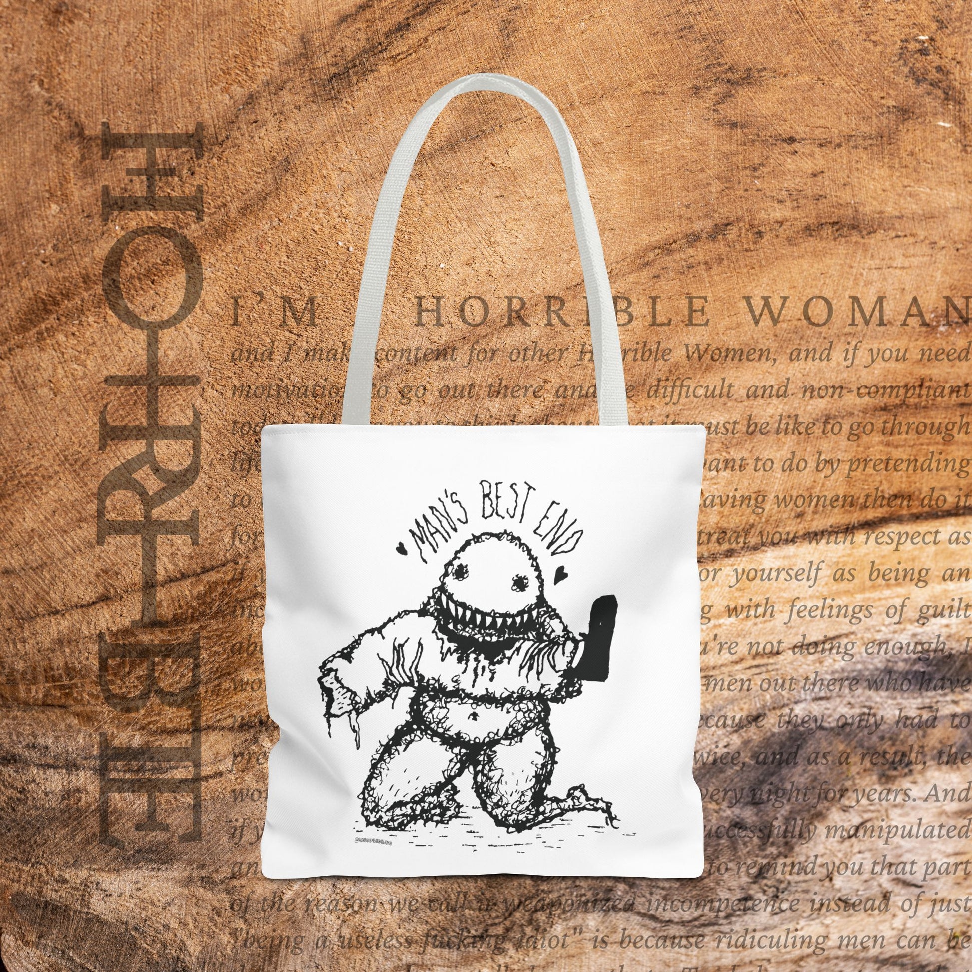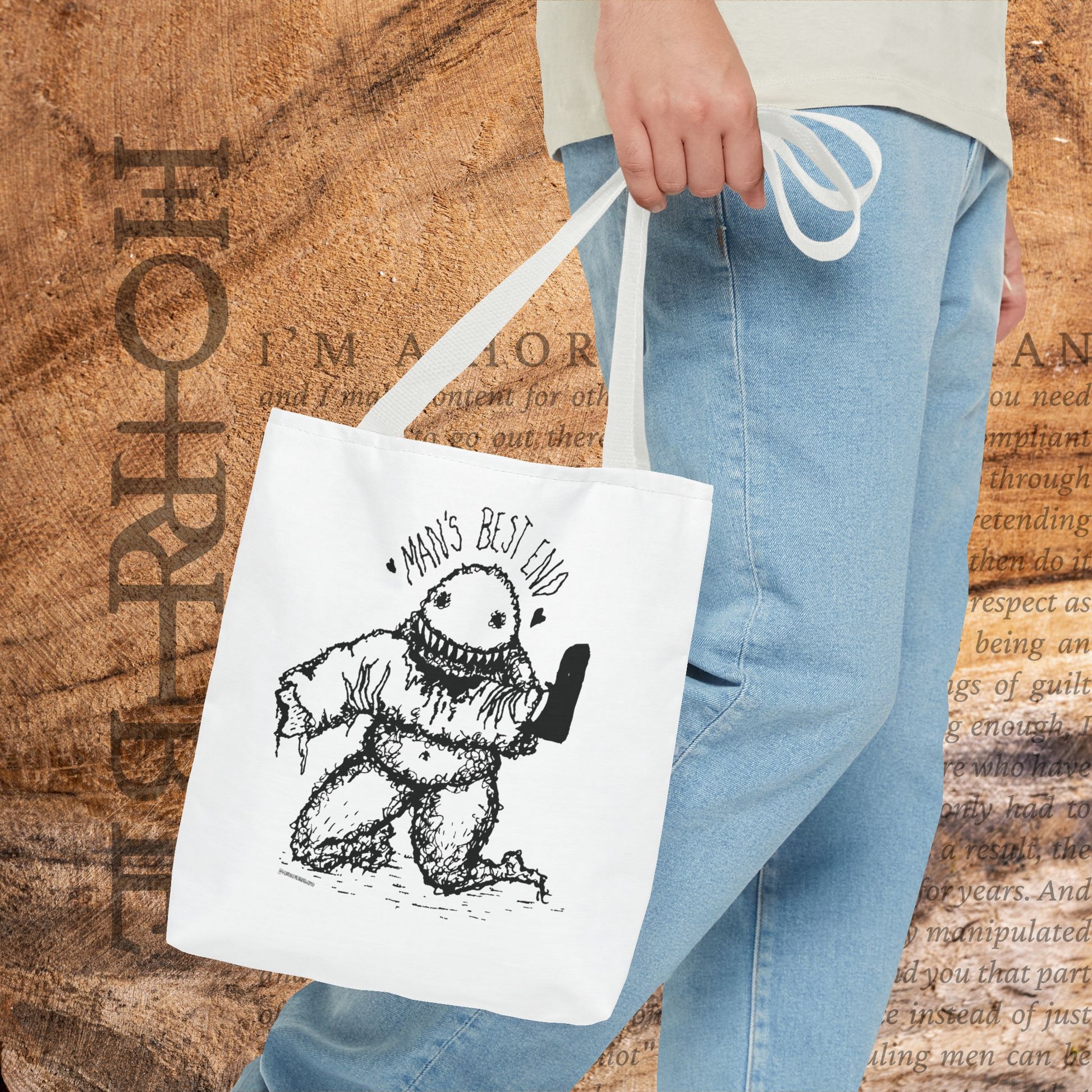 Design description: The Man’s Best End design is fuzzy, moody, and sparks joy into dark hearts. A large and sharp teeth filled smile is millimetres away from sinking into a man’s leg, as our monster is ready to chomp. The words “MAN’S BEST END” stretched vertically in black, uppercase letters sit on top of the scene, bookended by two little black hearts. This design will scare most children.