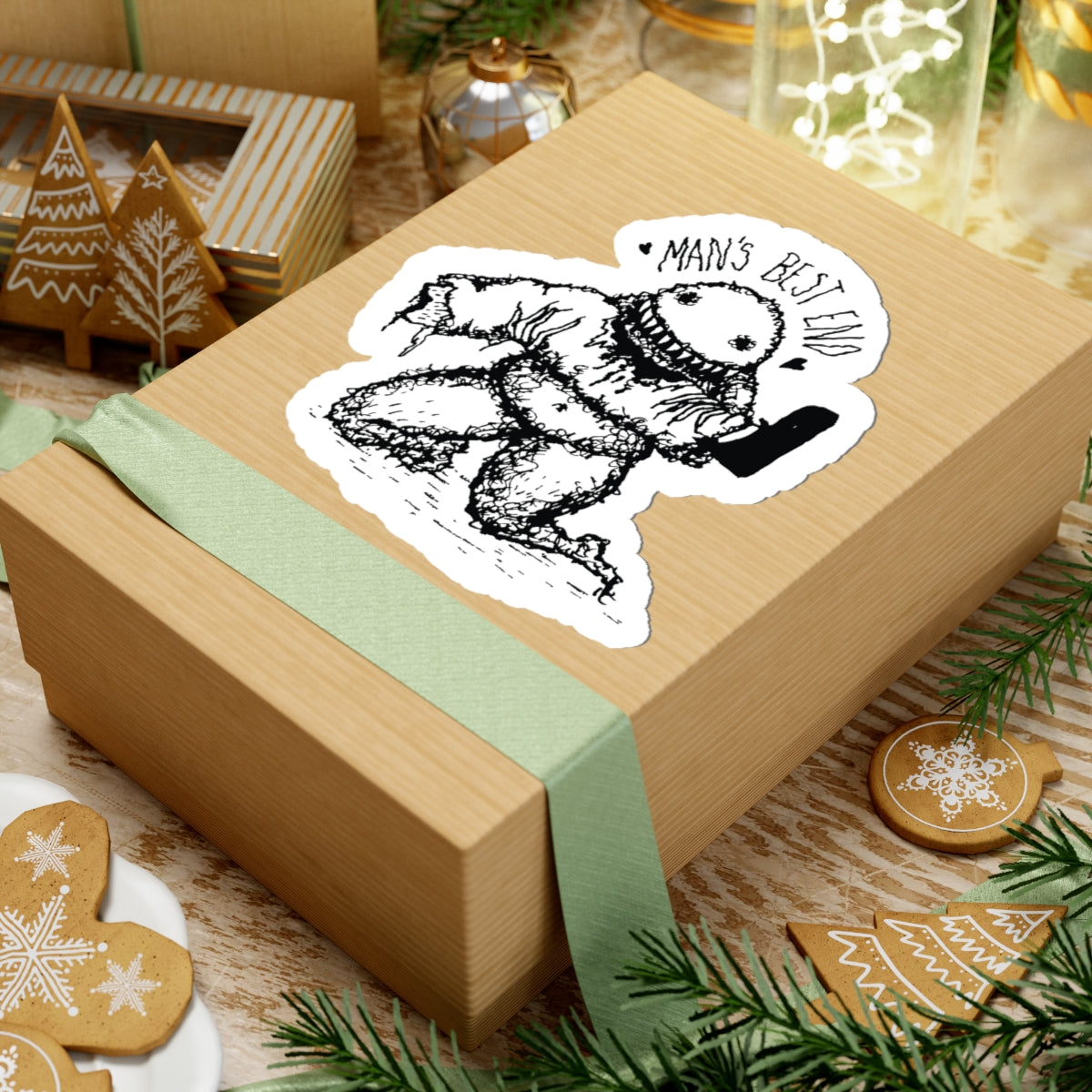 Design description: The Man’s Best End design is fuzzy, moody, and sparks joy into dark hearts. A large and sharp teeth filled smile is millimetres away from sinking into a man’s leg, as our monster is ready to chomp. The words “MAN’S BEST END” stretched vertically in black, uppercase letters sit on top of the scene, bookended by two little black hearts. This design will scare most children.