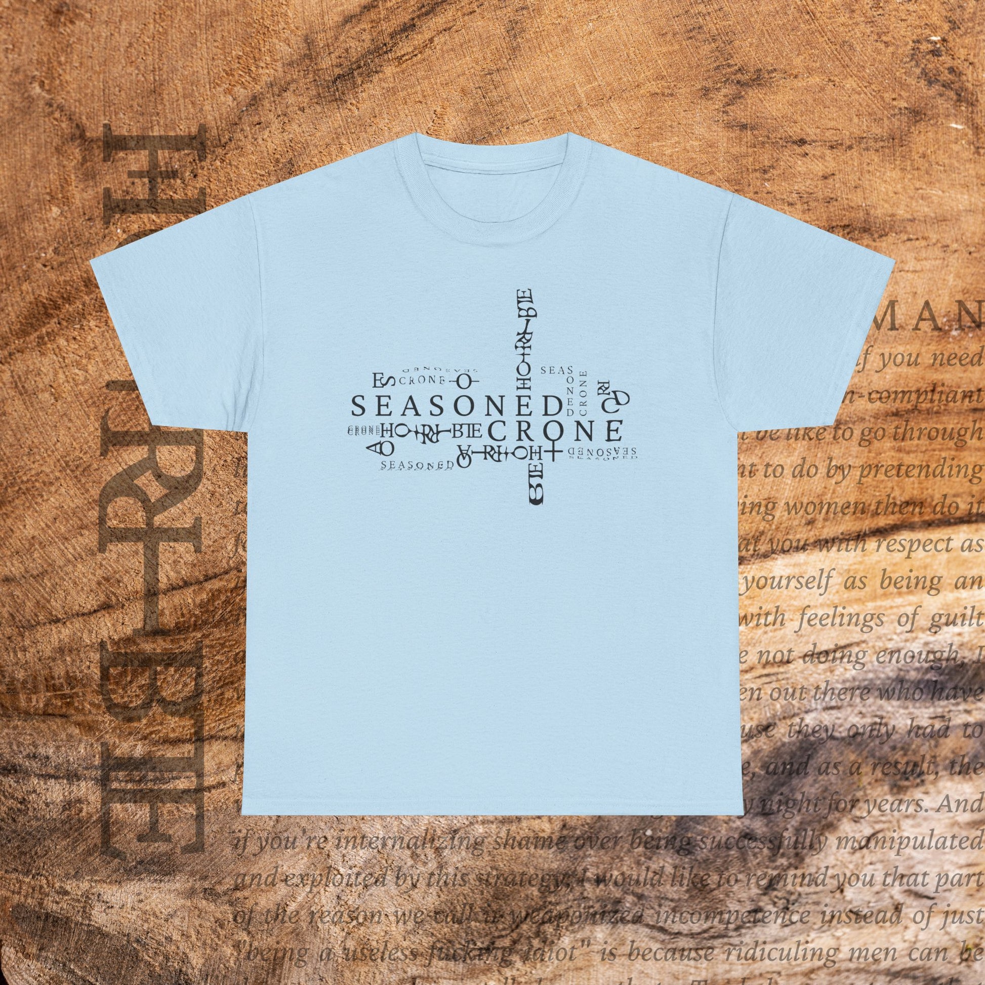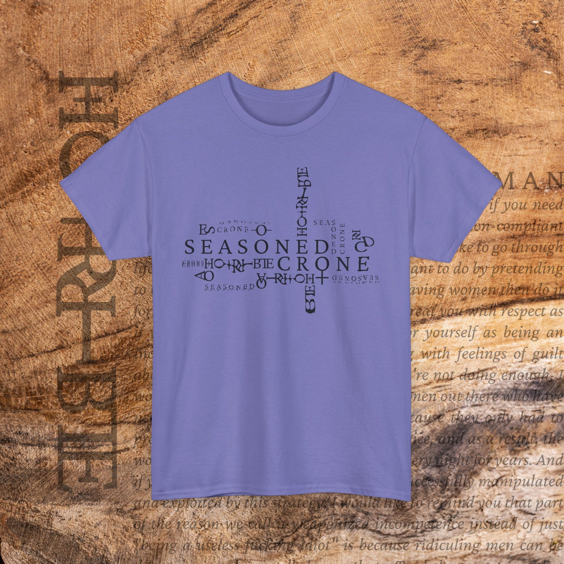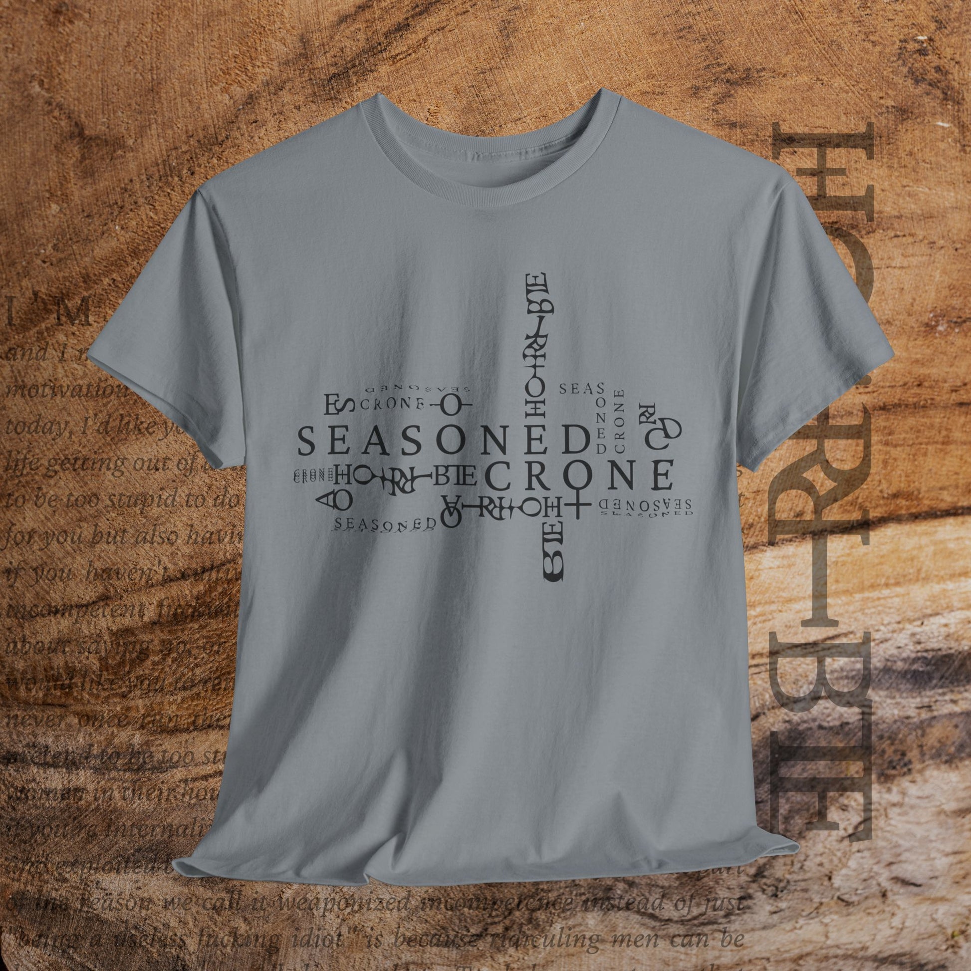 Design description: Crone. Noun. An ‘ugly’, evil-looking old woman.The Seasoned Crone design is a witchy, overlapping word map with the labels “SEASONED CRONE” and “HORRIBLE” in all sorts of directions. The black text swirls (and sometimes stretches or bends) creating a jumble of letters that feels spell bound and non-symmetrical.