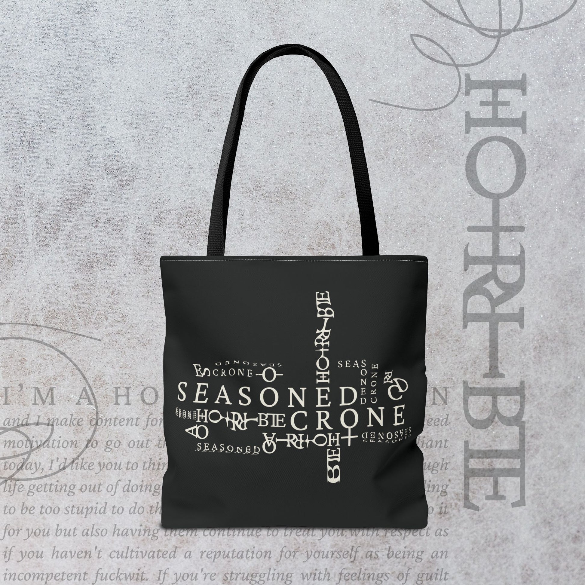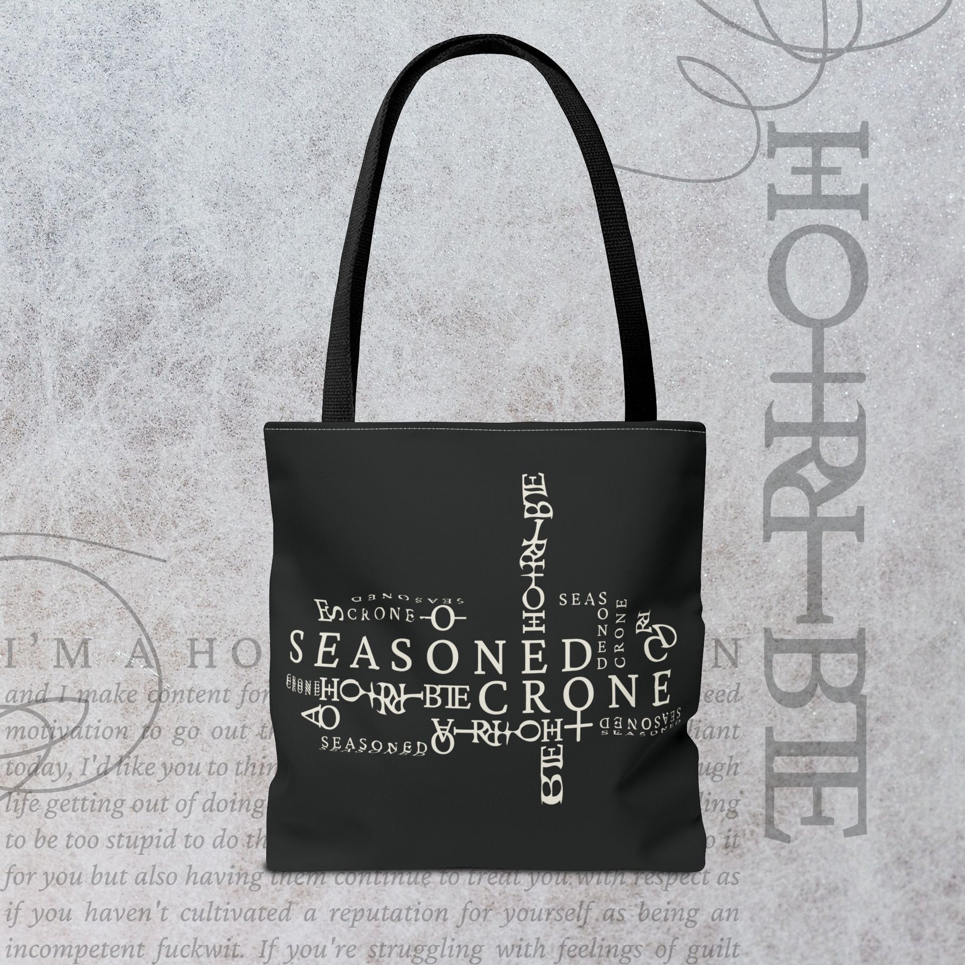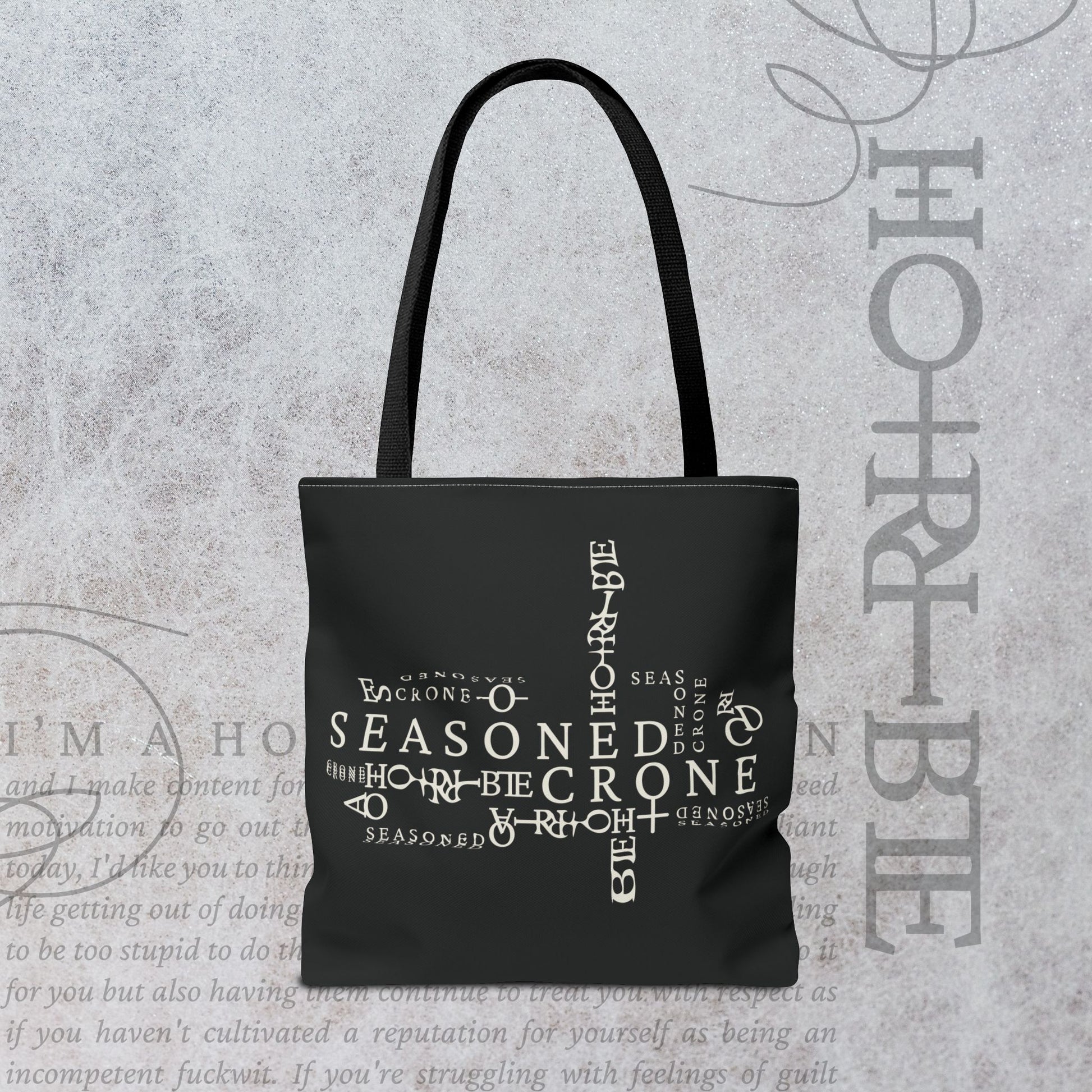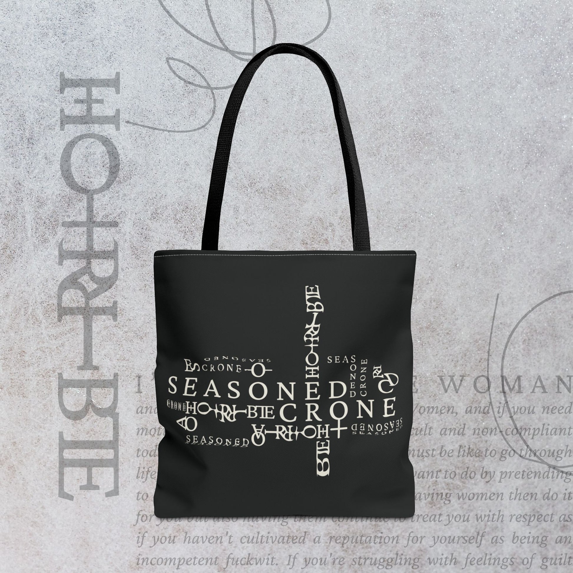 Design description: Crone. Noun. An ‘ugly’, evil-looking old woman.The Seasoned Crone design is a witchy, overlapping word map with the labels “SEASONED CRONE” and “HORRIBLE” in all sorts of directions. The black text swirls (and sometimes stretches or bends) creating a jumble of letters that feels spell bound and non-symmetrical.